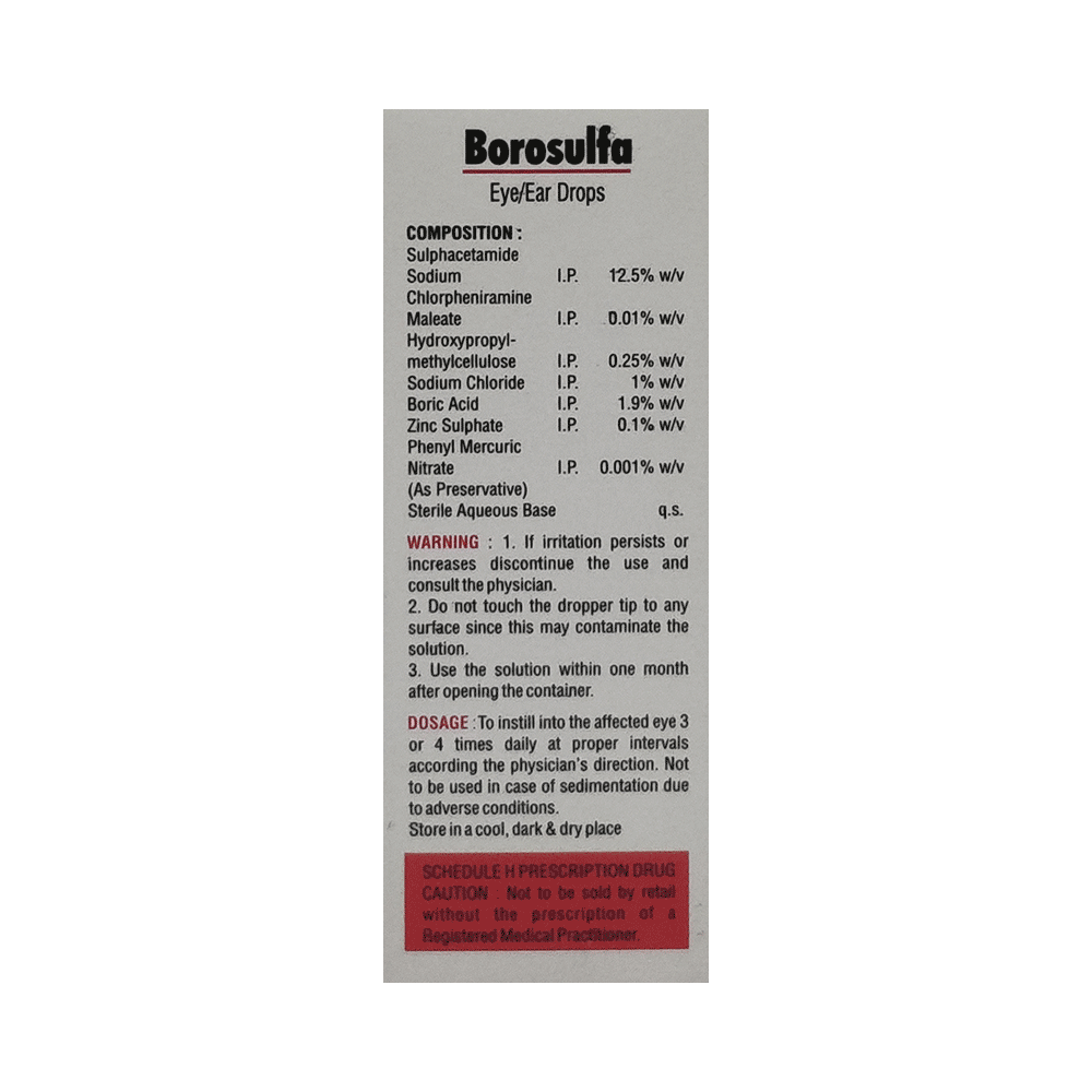 Borosulfa Eye/Ear Drop is a medicine used to treat bacterial eye infections. It kills and prevents the growth of infection-causing bacteria. This way it relieves the symptoms such as itching, irritation, redness, and teary eyes. Borosulfa Eye/Ear Drop is to be used only in the affected eye. Read the label carefully for instruction before you use the medicine. Use it in the exact dose and duration as advised by the doctor or as instructed in the label. Wash your hands before using this medicine. Complete your dose even if you feel better. Stopping the medicine too early may bring back the infection.Use of this medicine may cause irritation, stinging, and burning eyes, blurred vision, and photophobia. These are usually temporary and resolve with time. However, if they persist or get worse, inform your doctor. In case of accidental contact with your ears, nose, or mouth, immediately rinse it with water.Inform your doctor if you have a known allergy to any of the ingredients in this medicine or if you are taking any other medication. It is advised not to drive or operate heavy machinery immediately after using this medicine, as it may cause temporary blurring of vision and may affect your ability to drive.