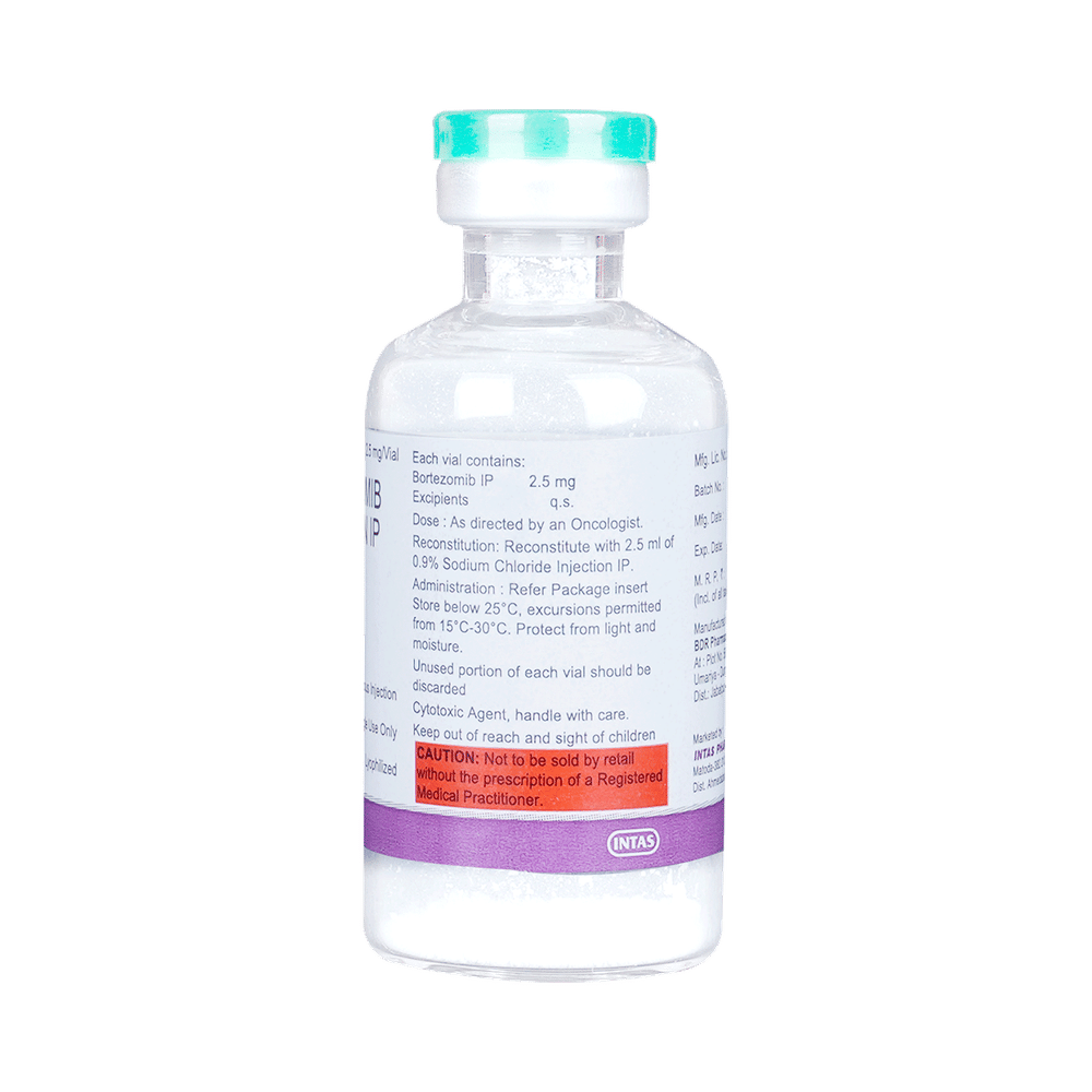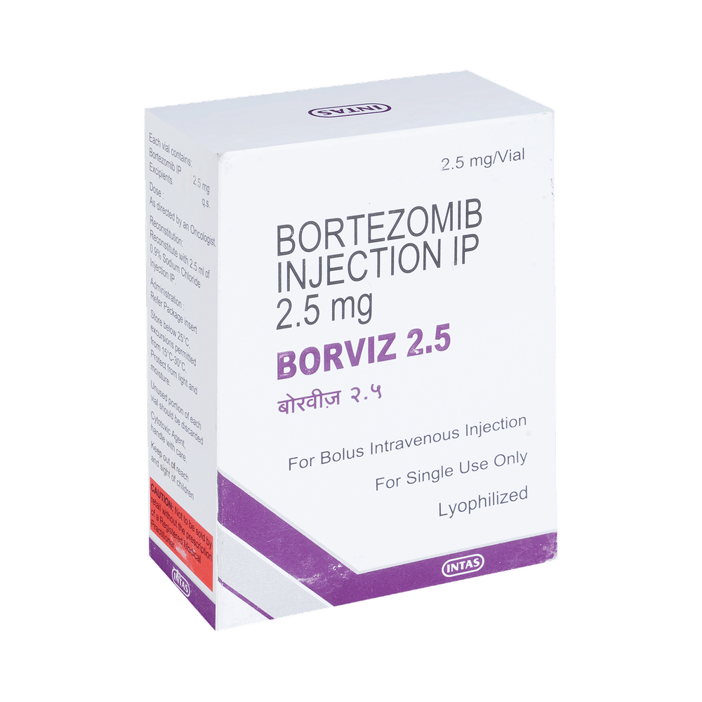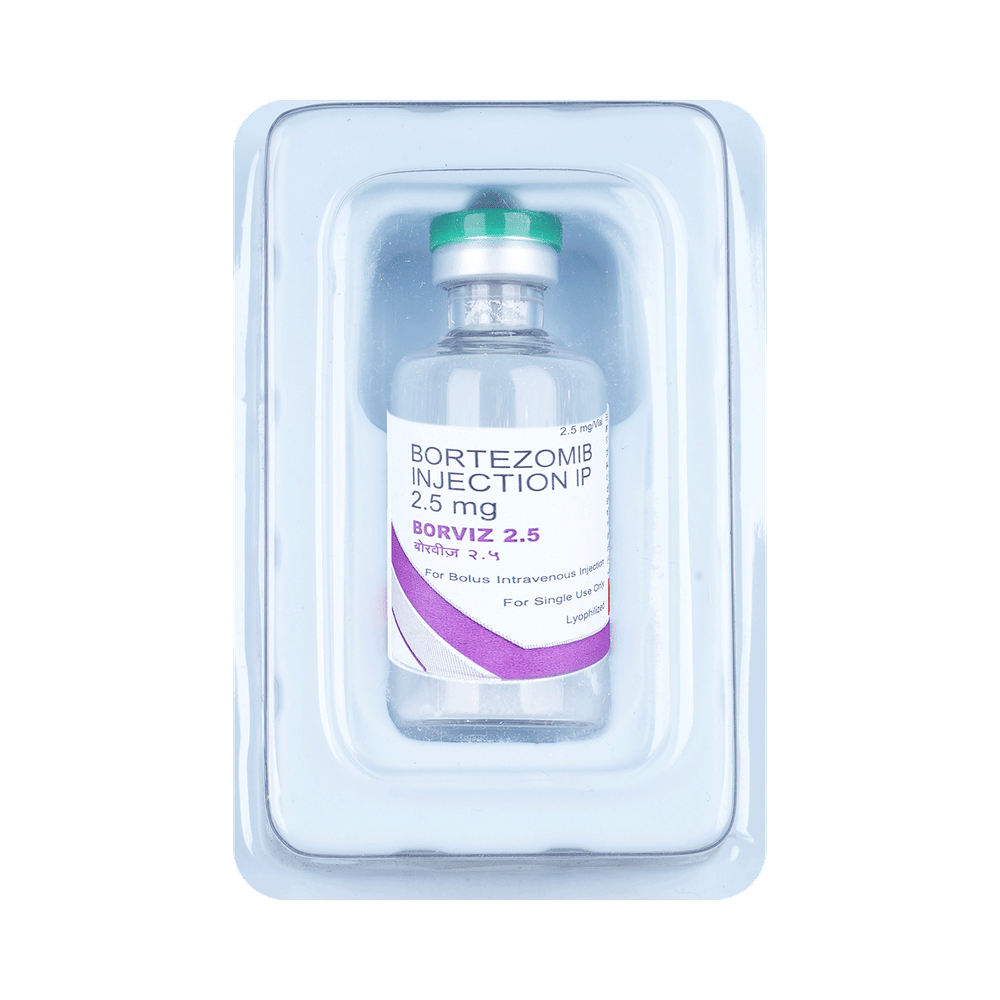 Borviz 2.5 Injection is used in the treatment of multiple myeloma and mantle-cell lymphoma. It shows its working by stopping or slowing down the growth of cancer cells. Borviz 2.5 Injection is given as an injection by a qualified medical professional. Your doctor will decide what dose is necessary and how often you need to take it. This will depend on what you are being treated for and may change from time to time. You should take it exactly as your doctor has advised. Taking it in the wrong way or taking too much can cause very serious side effects. It may take several weeks or months for you to see or feel the benefits but do not stop taking it unless your doctor tells you to.Fatigue, nausea, vomiting, and loss of appetite are some common side effects of this medicine. You may be advised to drink plenty of fluids every day during the treatment. You should not drive or operate machinery as medicine may cause tiredness and dizziness. This medicine may reduce the number of blood cells (decrease red blood and white blood cells) in your blood, thereby, increasing the susceptibility to infections. Regular blood tests are required to check your blood cells along with heart, liver, and blood uric acid levels.Before taking Borviz 2.5 Injection, consult with your doctor if you have any liver, kidney, heart disease or bleeding problem. It is important to consult a doctor if you develop symptoms like memory loss or trouble in thinking. Many other medicines can affect, or be affected by, this medicine so let your healthcare team know all medications you are using. This medicine is not recommended during pregnancy or while breastfeeding. The use of effective contraception by both males and females during treatment is important to avoid pregnancy.