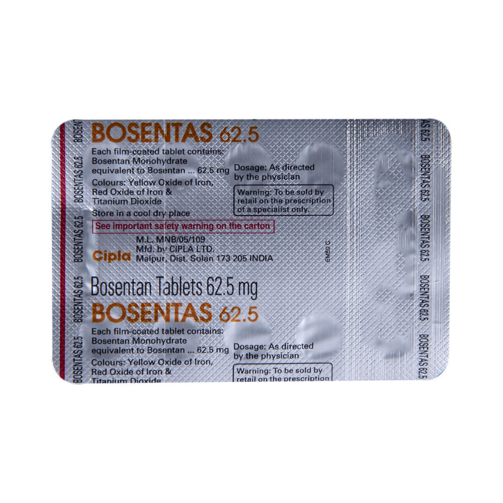 Bosentas 62.5 Tablet is a prescription medicine used to treat pulmonary arterial hypertension (high pressure in the blood vessels that carry blood from the heart to the lungs). It even helps to improve your quality of life, exercising ability and delay in disease progression. Bosentas 62.5 Tablet should be taken with or without food. This medicine should be used regularly to get the most benefit from it. The dose and how often you take it depends on what you are taking it for. Your doctor will decide how much you need to improve your symptoms. You should take this medicine for as long as it is prescribed for you.The most common side effects of this medicine include headache, swelling of the legs and ankles, and diarrhea. If these bother you or appear serious, let your doctor know. There may be ways of reducing or preventing them. Some serious side effects which mean your doctor should know immediately include Anemia (low number of red blood cells) and abnormal liver function such as nausea, vomiting, dark urine, fever, and dark urine. Your doctor might check you for blood tests to check for anemia and liver function.Before taking this medicine, let your doctor know if you have liver dysfunctioning. Inform your doctor if you are pregnant or breastfeeding. Women are suggested to use reliable contraceptive pills to avoid pregnancy and should continue even after one month of stopping the treatment. Your doctor should also know about all other medicines you are taking as many of these may make this medicine less effective or change the way it works.