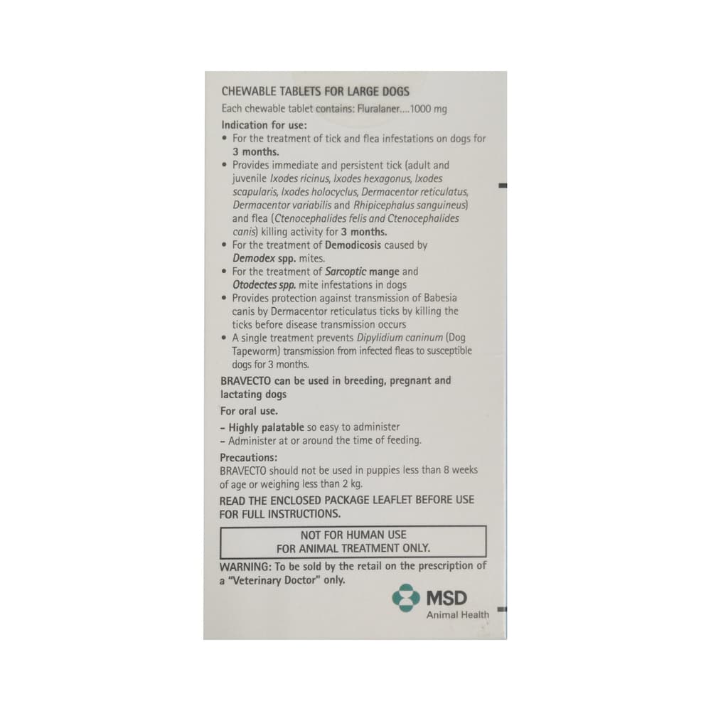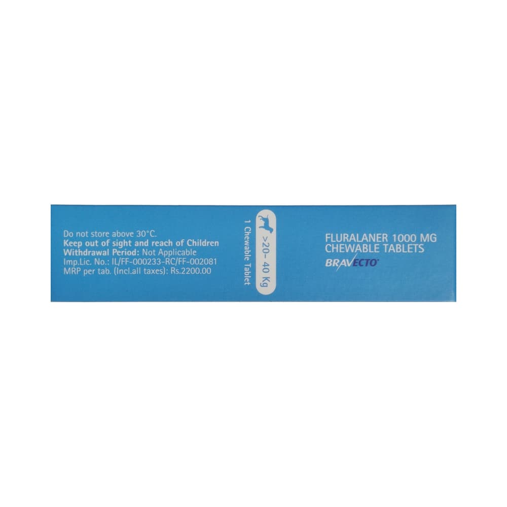 Explore the benefits of Bravecto 1000mg Pet Chewable Tablet (For > 20-40 Kg). Use as directed by your physician or as described in the instructions.