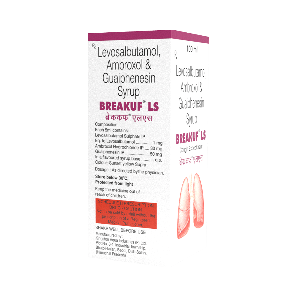 Breakuf LS Syrup is a combination medicine used in the treatment of cough with mucus. It thins mucus in the nose, windpipe, and lungs, making it easier to cough out. It also provides relief from runny nose, sneezing, itching, and watery eyes. Breakuf LS Syrup is taken with or without food in a dose and duration as advised by the doctor. The dose you are given will depend on your condition and how you respond to the medicine. You should keep taking this medicine for as long as your doctor recommends. If you stop treatment too early your symptoms may come back and your condition may worsen. Let your healthcare team know about all other medications you are taking as some may affect, or be affected by this medicine.The most common side effects are nausea, diarrhea, stomach pain, vomiting, muscle cramp, headache, skin rash, and increased heart rate. Most of these are temporary and usually resolve with time. Contact your doctor straight away if you are at all concerned about any of these side effects. This medicine can also cause sleepiness, so do not drive or do anything that requires mental focus until you know how this medicine affects you. Avoid drinking alcohol while taking this medicine as it can make sleepiness worse.Never support self-medication or recommend your medicine to another person. It is beneficial to have plenty of fluids while taking this medication. Before taking this medicine, you should tell your doctor if you are pregnant, planning pregnancy, or breastfeeding. You should also tell your doctor if you have any kidney or liver diseases so that your doctor can prescribe a suitable dose for you.