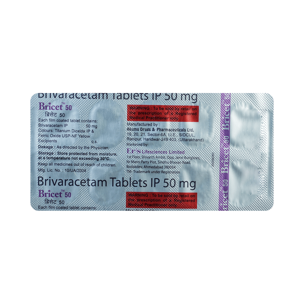 Bricet 50mg Tablet is an anti-epileptic medicine used to treat seizures (fits) in epilepsy. It can be used alone or along with other medicines. It helps to prevent seizures for as long as you continue to take it. Bricet 50mg Tablet suppresses the abnormal electrical activity in the brain. You can take it regularly with or without food but try to take it at the same time each day to get the most benefit. The dose and how often you need it will be decided by your doctor so that you get the right amount to control your seizures. It may be increased gradually.It is generally advised as a long-term treatment. You should continue taking it for as long as your doctor has told you to, even if you feel well. If you stop or miss doses your seizures could get worse. Do not stop taking this medicine unless your doctor tells you to. This is because stopping the medicine suddenly could make your seizures worse.Some common side effects of this medicine include dizziness, headache, nausea, and vomiting. You may also experience behavioral changes, aggressive behavior, irritation, agitation, etc. Side effects are more common during the first few weeks and usually lessen as your body gets used to the medicine. Most of these side effects do not need medical attention, but some of them can be serious. A small number of people being treated with this medicine have had thoughts of harming or killing themselves. Contact your doctor if your mood changes for the worse.Before taking it, you should tell your doctor if you have liver or kidney-related problems, depression, or suicidal thoughts, and if you are pregnant or planning to become pregnant. Breastfeeding mothers should also consult their doctor before taking this medicine.