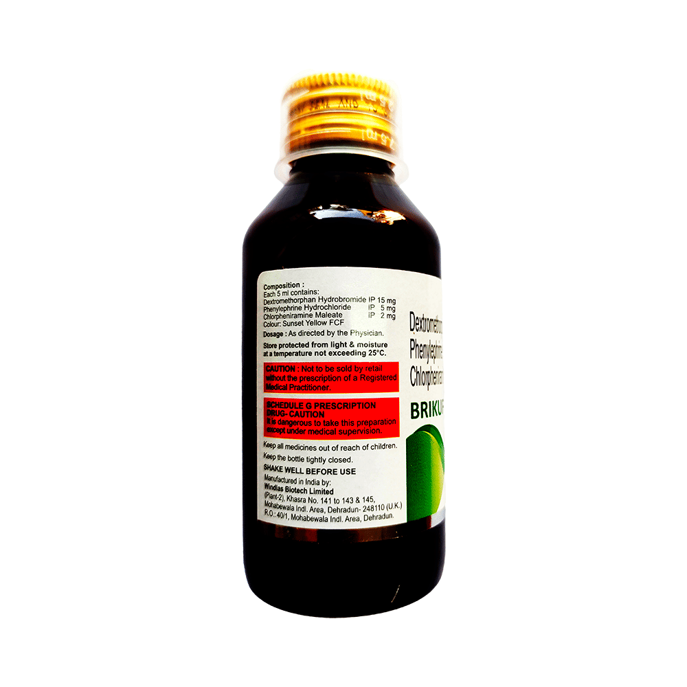 Brikuff-DX Syrup is a medicine used in the treatment of common cold and cough. It can provide quick relief from cough and common cold symptoms like runny nose, stuffy nose, sneezing, watery eyes, and congestion or stuffiness. Brikuff-DX Syrup is taken with or without food in a dose and duration as advised by the doctor. The dose you are given will depend on your condition and how you respond to the medicine. You should keep taking this medicine for as long as your doctor recommends. If you stop treatment too early your symptoms may come back and your condition may worsen. Let your healthcare team know about all other medications you are taking as some may affect, or be affected by this medicine.Common side effects of this medicine include headache, sedation, double vision, vomiting, diarrhea, dry mouth, and nausea. Most of these are temporary and usually resolve with time. Contact your doctor straight away if you are at all concerned about any of these side effects. This medicine can also cause sleepiness, so do not drive or do anything that requires mental focus until you know how this medicine affects you. Avoid drinking alcohol while taking this medicine as it can worsen your sleepiness.Never support self-medication or recommend your medicine to another person. It is beneficial to have plenty of fluids while taking this medication. Before taking this medicine, you should tell your doctor if you are pregnant, planning pregnancy or breastfeeding. You should also tell your doctor if you have any kidney or liver diseases so that your doctor can prescribe a suitable dose for you.