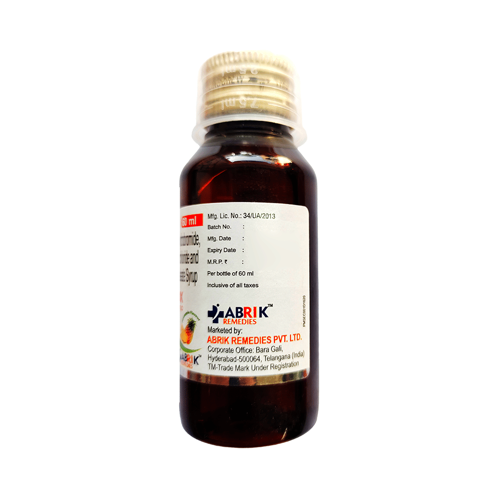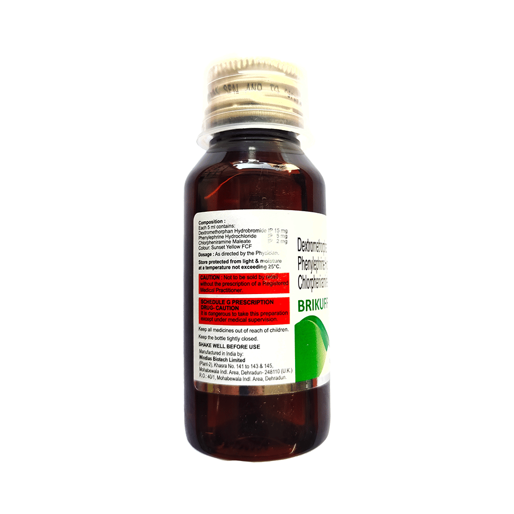 Brikuff-DX Syrup is a medicine used in the treatment of common cold and cough. It can provide quick relief from cough and common cold symptoms like runny nose, stuffy nose, sneezing, watery eyes, and congestion or stuffiness. Brikuff-DX Syrup is taken with or without food in a dose and duration as advised by the doctor. The dose you are given will depend on your condition and how you respond to the medicine. You should keep taking this medicine for as long as your doctor recommends. If you stop treatment too early your symptoms may come back and your condition may worsen. Let your healthcare team know about all other medications you are taking as some may affect, or be affected by this medicine.Common side effects of this medicine include headache, sedation, double vision, vomiting, diarrhea, dry mouth, and nausea. Most of these are temporary and usually resolve with time. Contact your doctor straight away if you are at all concerned about any of these side effects. This medicine can also cause sleepiness, so do not drive or do anything that requires mental focus until you know how this medicine affects you. Avoid drinking alcohol while taking this medicine as it can worsen your sleepiness.Never support self-medication or recommend your medicine to another person. It is beneficial to have plenty of fluids while taking this medication. Before taking this medicine, you should tell your doctor if you are pregnant, planning pregnancy or breastfeeding. You should also tell your doctor if you have any kidney or liver diseases so that your doctor can prescribe a suitable dose for you.