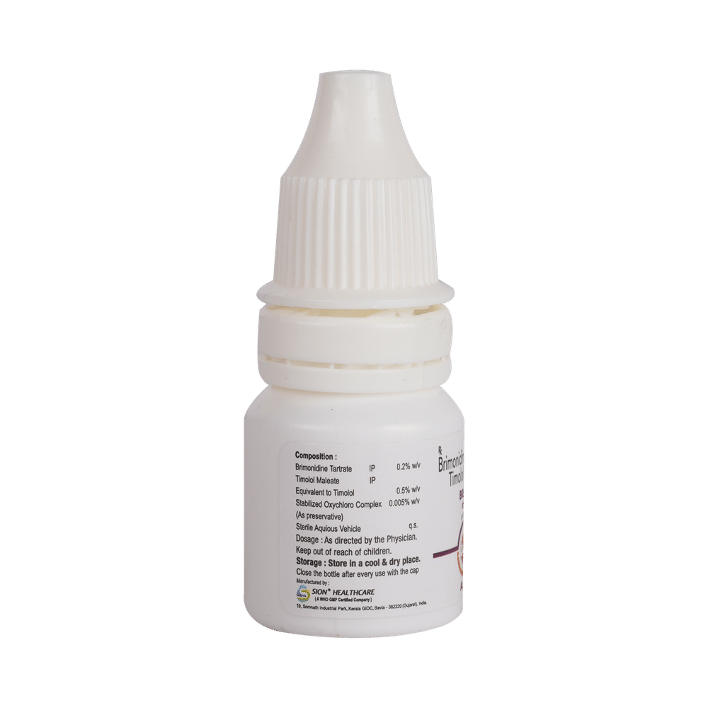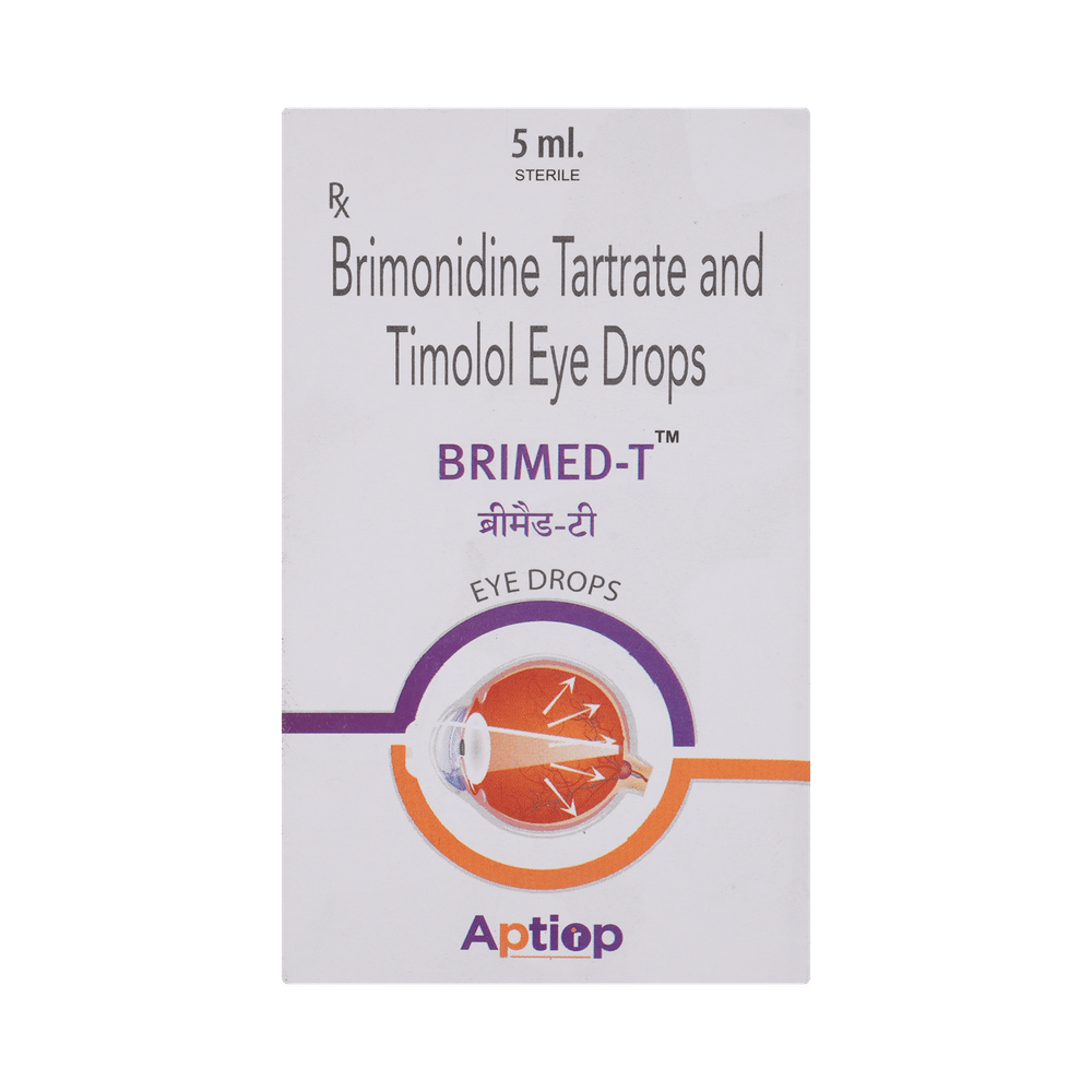 Brimed T Eye Drop is a prescription medicine used for the treatment of pressure in the eyes (ocular hypertension) and glaucoma. It works by decreasing the pressure of fluid in the eye (aqueous humor), which helps in lowering the increased eye pressure. Brimed T Eye Drop is to be used only in the affected eye in the dose and duration as advised by the doctor. Wash your hands before using this medicine. Check the label thoroughly for directions before use. Do not skip any doses and finish the full course of treatment even if you feel better.The most common side effects include burning, irritation, itching, and redness at the application site, sleepiness, and decreased alertness. If these side effects persist for a longer duration, inform your doctor. In case of accidental contact with your nose or mouth, immediately rinse it off with plenty of water. Do not drive or operate heavy machinery immediately after the use of this medicine as it may cause temporary blurring of vision and may affect your ability to drive.