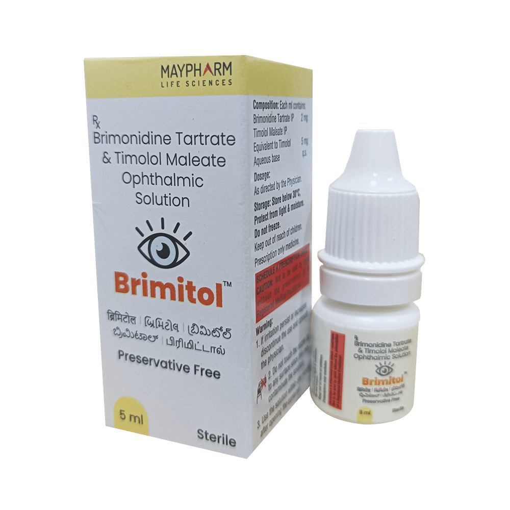 Brimitol Ophthalmic Solution is a prescription medicine used for the treatment of pressure in the eyes (ocular hypertension) and glaucoma. It works by decreasing the pressure of fluid in the eye (aqueous humor), which helps in lowering the increased eye pressure. Brimitol Ophthalmic Solution is to be used only in the affected eye in the dose and duration as advised by the doctor. Wash your hands before using this medicine. Check the label thoroughly for directions before use. Do not skip any doses and finish the full course of treatment even if you feel better.The most common side effects include burning, irritation, itching, and redness at the application site, sleepiness, and decreased alertness. If these side effects persist for a longer duration, inform your doctor. In case of accidental contact with your nose or mouth, immediately rinse it off with plenty of water. Do not drive or operate heavy machinery immediately after the use of this medicine as it may cause temporary blurring of vision and may affect your ability to drive.