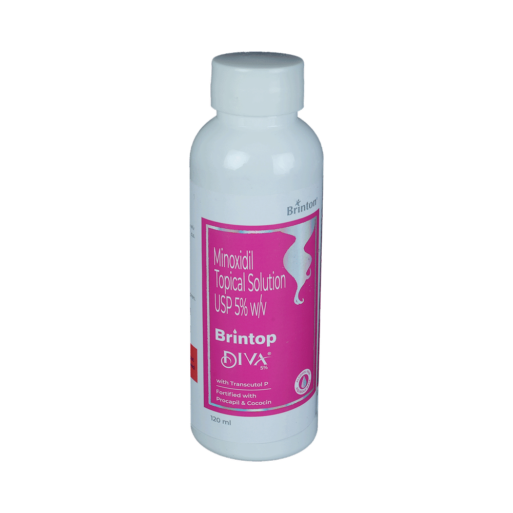 Brintop Diva 5% Topical Solution belongs to a class of drugs known as vasodilators. It is used to promote hair growth in men with male pattern baldness by improving blood flow to hair follicles, helping slow hair loss, and encouraging new hair growth when used regularly. Brintop Diva 5% Topical Solution should only be applied directly to the scalp area in the amount and in the way specified on the label or by your doctor. Clean and dry your scalp before using it. It may take approximately 2- 4 months to notice any hair growth. The first growth may be soft, colourless, and barely visible. Using more than recommended will not speed up hair growth and may increase the likelihood of side effects. This medication must be used continuously to maintain hair growth. Tell your doctor if your condition does not improve or worsen after using it for 4 to 6 months.The most common side effects of this medicine include itching, excessive hair growth, rash, and dermatitis. In case of accidental application in other areas, it may result in unwanted hair growth. Rinse thoroughly with plenty of water if you get it in your eyes, mouth, or broken skin. Talk to your doctor if you are bothered by the side effects or if they do not go away.People under 18 or over 65 should not usually use Brintop Diva 5% Topical Solution. It may also not be appropriate if your hair loss is due to medications (such as chemotherapy) or any nutritional deficiency. You should also not use this medicine if you have high blood pressure or use other creams or lotions to treat other scalp conditions. Talk to your doctor if you have heart disease or blood circulation problems.