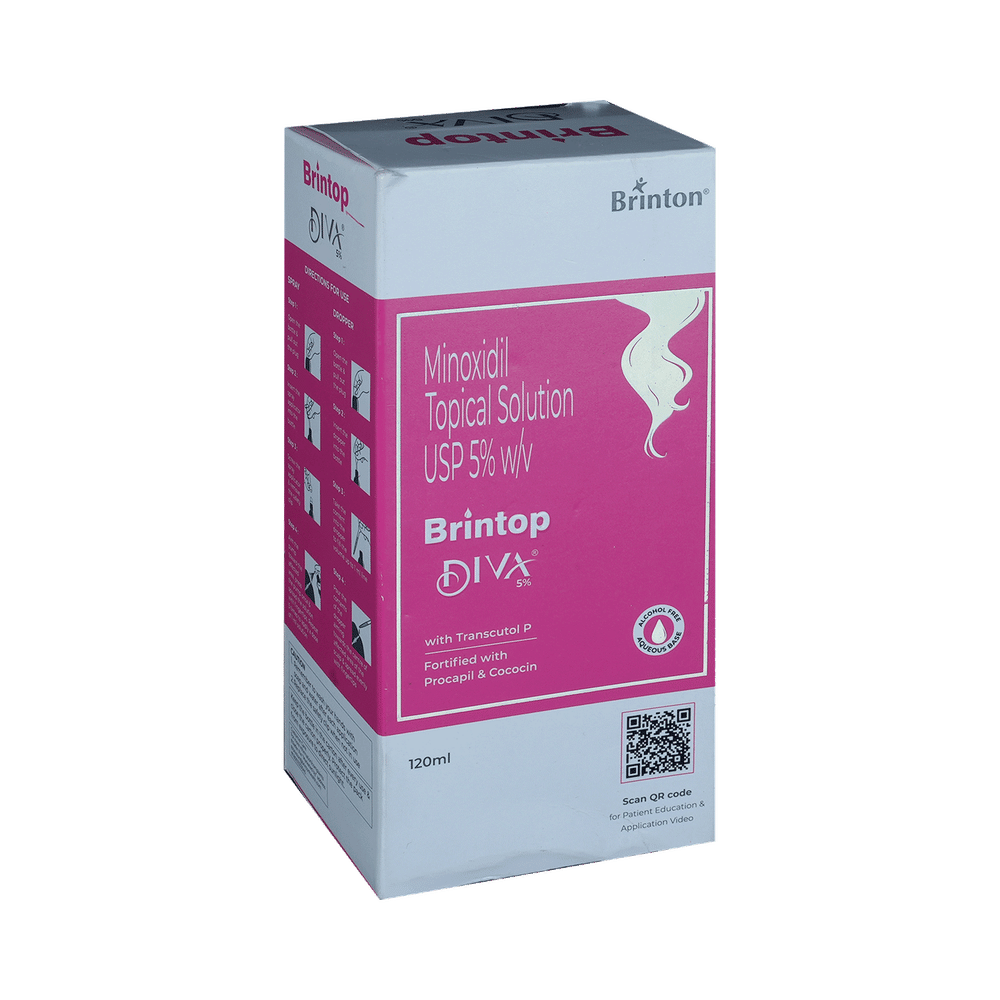 In Treatment of Hair lossBrintop Diva 5% Topical Solution is a medicine used to treat common hereditary hair loss. It can prevent further hair loss and help hair to regrow. It works by increasing blood flow to the hair follicles on your scalp, which prevents hair cell death and also enhances new hair growth. It is most effective for baldness or thinning at the top of the scalp, but less effective at the front or for receding hairline.Benefits are less likely if you have been bald for many years or have a large area of hair loss. Brintop Diva 5% Topical Solution is not suitable for sudden or unexplained hair loss. It is considered a safe medicine. There are separate products for men and women, and you should follow your doctor’s instructions carefully while using Brintop Diva 5% Topical Solution. Regrowth of hair improves your appearance, boosts your confidence, and enhances your social life. Use it regularly to maintain hair growth and to get the maximum benefits. Consult your doctor if you notice any changes in the hair growth while using Brintop Diva 5% Topical Solution.