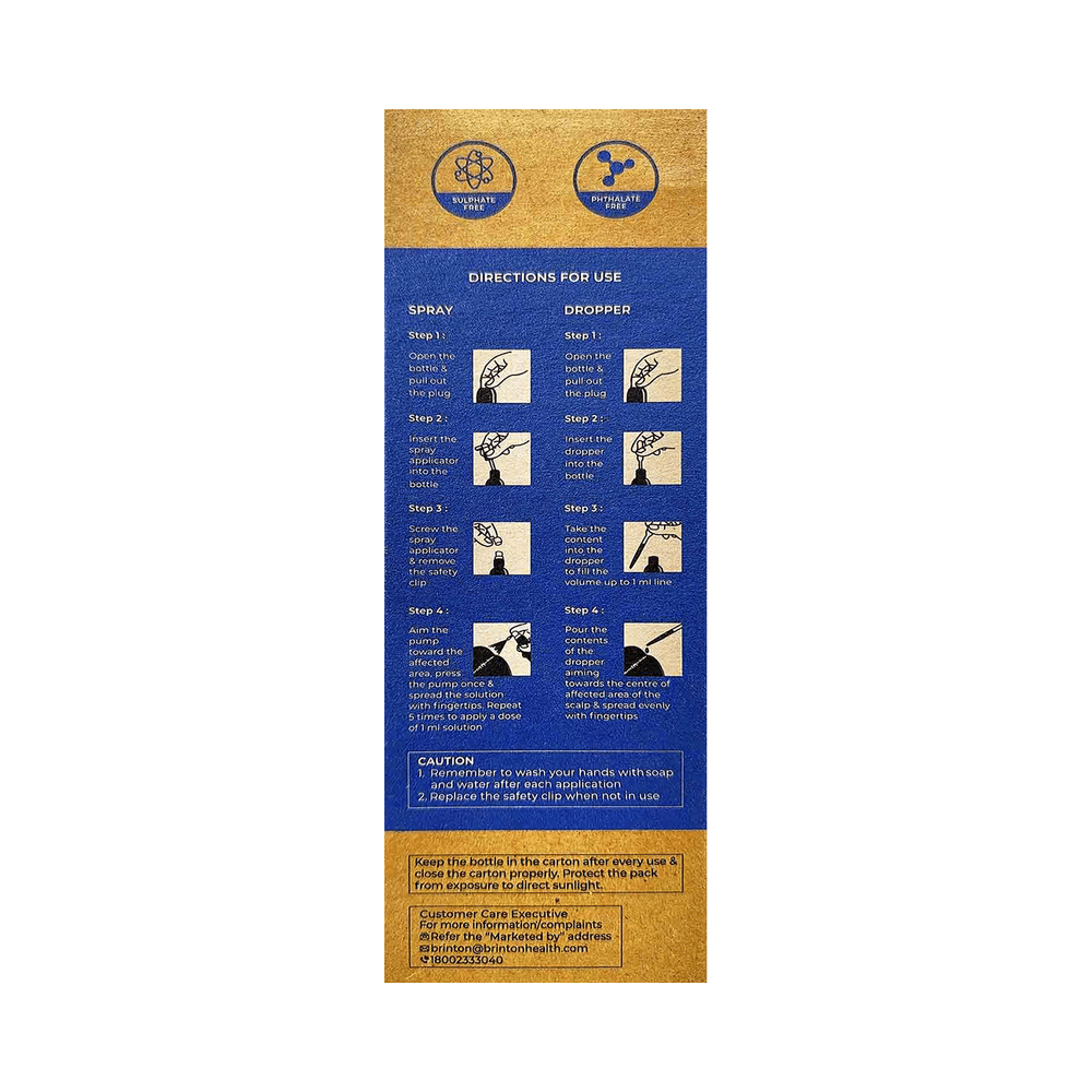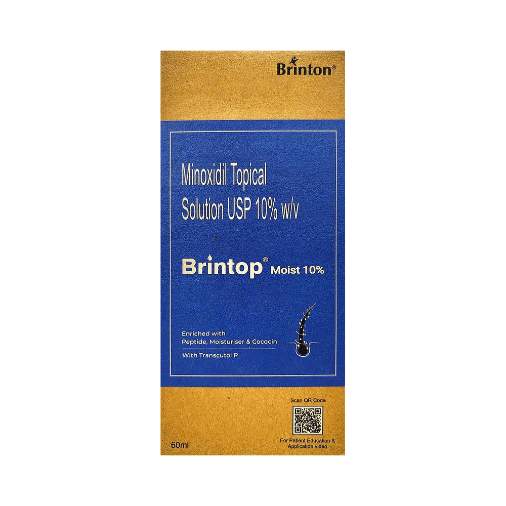 Brintop Moist 10% Solution belongs to a class of drugs known as vasodilators. It is used to promote hair growth in men with male pattern baldness by improving blood flow to hair follicles, helping slow hair loss, and encouraging new hair growth when used regularly. Brintop Moist 10% Solution should only be applied directly to the scalp area in the amount and in the way specified on the label or by your doctor. Clean and dry your scalp before using it. It may take approximately 2- 4 months to notice any hair growth. The first growth may be soft, colourless, and barely visible. Using more than recommended will not speed up hair growth and may increase the likelihood of side effects. This medication must be used continuously to maintain hair growth. Tell your doctor if your condition does not improve or worsen after using it for 4 to 6 months.The most common side effects of this medicine include itching, excessive hair growth, rash, and dermatitis. In case of accidental application in other areas, it may result in unwanted hair growth. Rinse thoroughly with plenty of water if you get it in your eyes, mouth, or broken skin. Talk to your doctor if you are bothered by the side effects or if they do not go away.People under 18 or over 65 should not usually use Brintop Moist 10% Solution. It may also not be appropriate if your hair loss is due to medications (such as chemotherapy) or any nutritional deficiency. You should also not use this medicine if you have high blood pressure or use other creams or lotions to treat other scalp conditions. Talk to your doctor if you have heart disease or blood circulation problems.