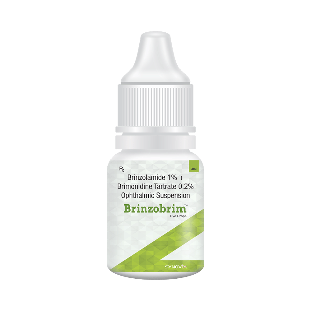 Brinzobrim Eye Drop is a prescription medicine having a combination of medicines that is used to treat glaucoma. It works by decreasing the pressure of fluid in the eye (aqueous humor), which helps in lowering the increased eye pressure. Brinzobrim Eye Drop is to be used only in the affected eye in the dose and duration as advised by the doctor. Wash your hands before using this medicine. It is advised to check the label for directions before use. Do not skip any doses and finish the full course of treatment even if you feel better.The most common side effects include burning sensation, irritation, itching, and redness at the application site. If these side effects persist for a longer duration, inform your doctor. In case of accidental contact with your ears, nose, or mouth, immediately rinse it off with water. It is advised not to drive or operate heavy machinery immediately after using this medicine as it may cause temporary blurring of vision.