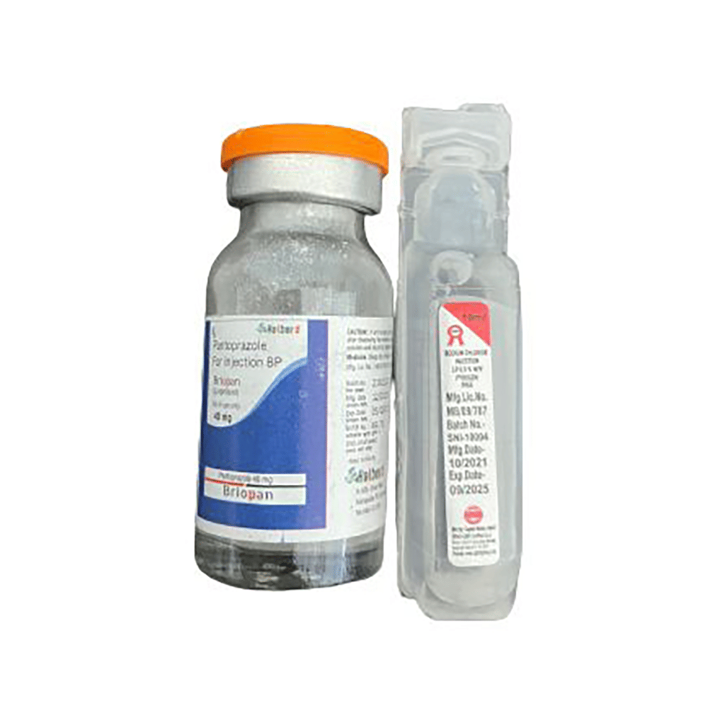 Briopan Injection is a medicine that reduces the amount of acid produced in your stomach. It is used for treating acid-related diseases of the stomach and intestine such as acid reflux, peptic ulcer disease, Zollinger-Ellison syndrome. It provides relief from symptoms and promotes healing. Briopan Injection is also used to prevent stress ulcers in seriously ill patients and is administered before anesthetic medication to help prevent aspiration-related complications. It belongs to a class of medicines known as proton pump inhibitors (PPIs). This medicine is administered into a vein by a healthcare professional and will only be given to you if your doctor thinks that an injection is more suitable for you at the moment than a tablet. The dose will depend on your underlying condition and how you respond to the medicine. Your doctor will decide the duration of treatment but you should keep on taking it as prescribed, even if your symptoms disappear quickly. You can increase the efficiency of the treatment by eating smaller meals more often and avoiding caffeinated drinks (like tea and coffee), and spicy or fatty foods.The most common side effects observed with this medicine include nausea, vomiting, headache, dizziness, flatulence, diarrhea, stomach pain, and thrombophlebitis (pain, redness, and swelling of the vein). These symptoms are generally mild but if they bother you or do not go away, consult your doctor. Long-term use of this medicine may lead to an increased risk of side effects. For instance, using this medicine for more than 1 year may increase your risk for bone fractures, especially with higher doses. Talk to your doctor about ways to prevent bone loss (osteoporosis), like taking calcium and vitamin D supplements.Briopan Injection is not suitable for some people. Before taking this medicine, you need to tell your doctor if you have severe liver problems, are taking medicines for HIV, have ever had an allergic reaction to similar medicines in the past, or suffer from bone loss (osteoporosis). Pregnant or breastfeeding women should also consult their doctor before taking it. Avoid drinking alcohol as it makes your stomach produce excessive acid and can worsen your symptoms. Do not drive or use machinery or tools, if this medicine makes you feel dizzy or sleepy.