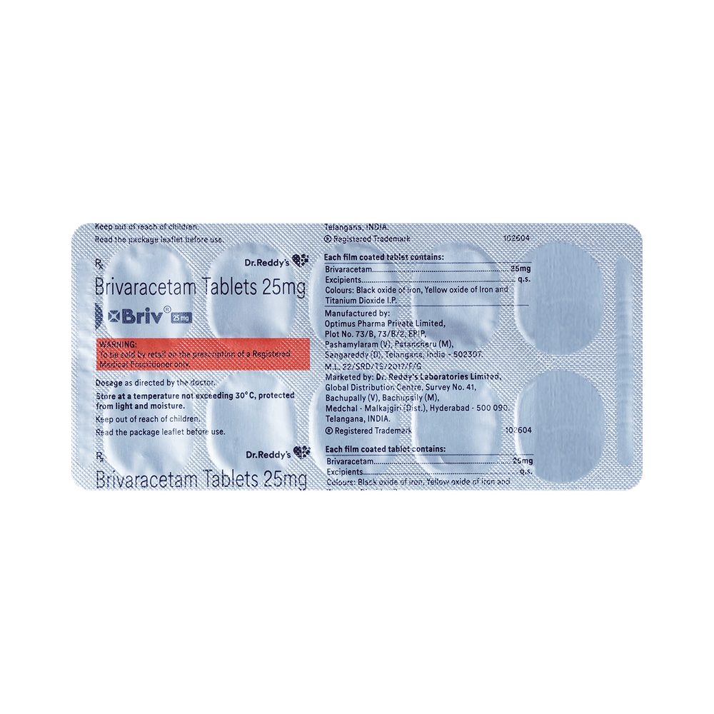 Briv 25mg Tablet is an anti-epileptic medicine used to treat seizures (fits) in epilepsy. It can be used alone or along with other medicines. It helps to prevent seizures for as long as you continue to take it. Briv 25mg Tablet suppresses the abnormal electrical activity in the brain. You can take it regularly with or without food but try to take it at the same time each day to get the most benefit. The dose and how often you need it will be decided by your doctor so that you get the right amount to control your seizures. It may be increased gradually.It is generally advised as a long-term treatment. You should continue taking it for as long as your doctor has told you to, even if you feel well. If you stop or miss doses your seizures could get worse. Do not stop taking this medicine unless your doctor tells you to. This is because stopping the medicine suddenly could make your seizures worse.Some common side effects of this medicine include dizziness, headache, nausea, and vomiting. You may also experience behavioral changes, aggressive behavior, irritation, agitation, etc. Side effects are more common during the first few weeks and usually lessen as your body gets used to the medicine. Most of these side effects do not need medical attention, but some of them can be serious. A small number of people being treated with this medicine have had thoughts of harming or killing themselves. Contact your doctor if your mood changes for the worse.Before taking it, you should tell your doctor if you have liver or kidney-related problems, depression, or suicidal thoughts, and if you are pregnant or planning to become pregnant. Breastfeeding mothers should also consult their doctor before taking this medicine.