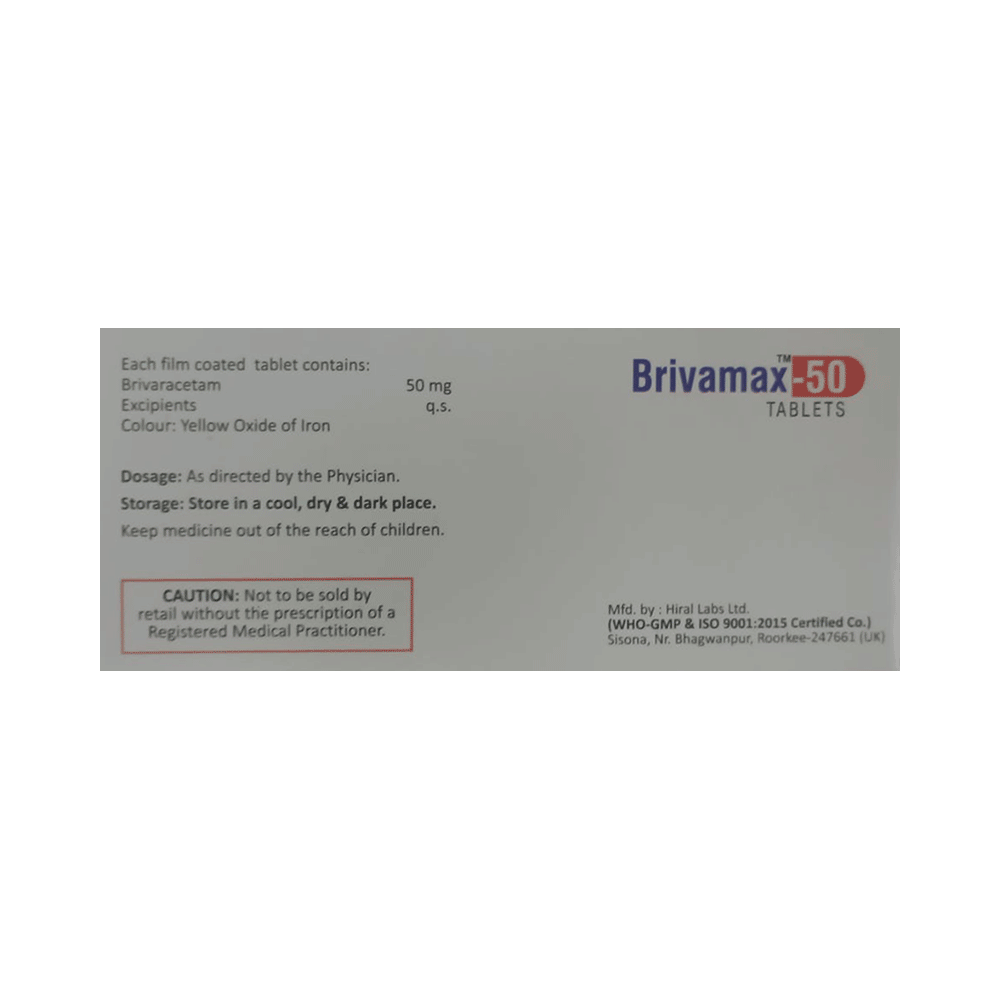 Brivamax 50 Tablet is an anti-epileptic medicine used to treat seizures (fits) in epilepsy. It can be used alone or along with other medicines. It helps to prevent seizures for as long as you continue to take it. Brivamax 50 Tablet suppresses the abnormal electrical activity in the brain. You can take it regularly with or without food but try to take it at the same time each day to get the most benefit. The dose and how often you need it will be decided by your doctor so that you get the right amount to control your seizures. It may be increased gradually.It is generally advised as a long-term treatment. You should continue taking it for as long as your doctor has told you to, even if you feel well. If you stop or miss doses your seizures could get worse. Do not stop taking this medicine unless your doctor tells you to. This is because stopping the medicine suddenly could make your seizures worse.Some common side effects of this medicine include dizziness, headache, nausea, and vomiting. You may also experience behavioral changes, aggressive behavior, irritation, agitation, etc. Side effects are more common during the first few weeks and usually lessen as your body gets used to the medicine. Most of these side effects do not need medical attention, but some of them can be serious. A small number of people being treated with this medicine have had thoughts of harming or killing themselves. Contact your doctor if your mood changes for the worse.Before taking it, you should tell your doctor if you have liver or kidney-related problems, depression, or suicidal thoughts, and if you are pregnant or planning to become pregnant. Breastfeeding mothers should also consult their doctor before taking this medicine.
