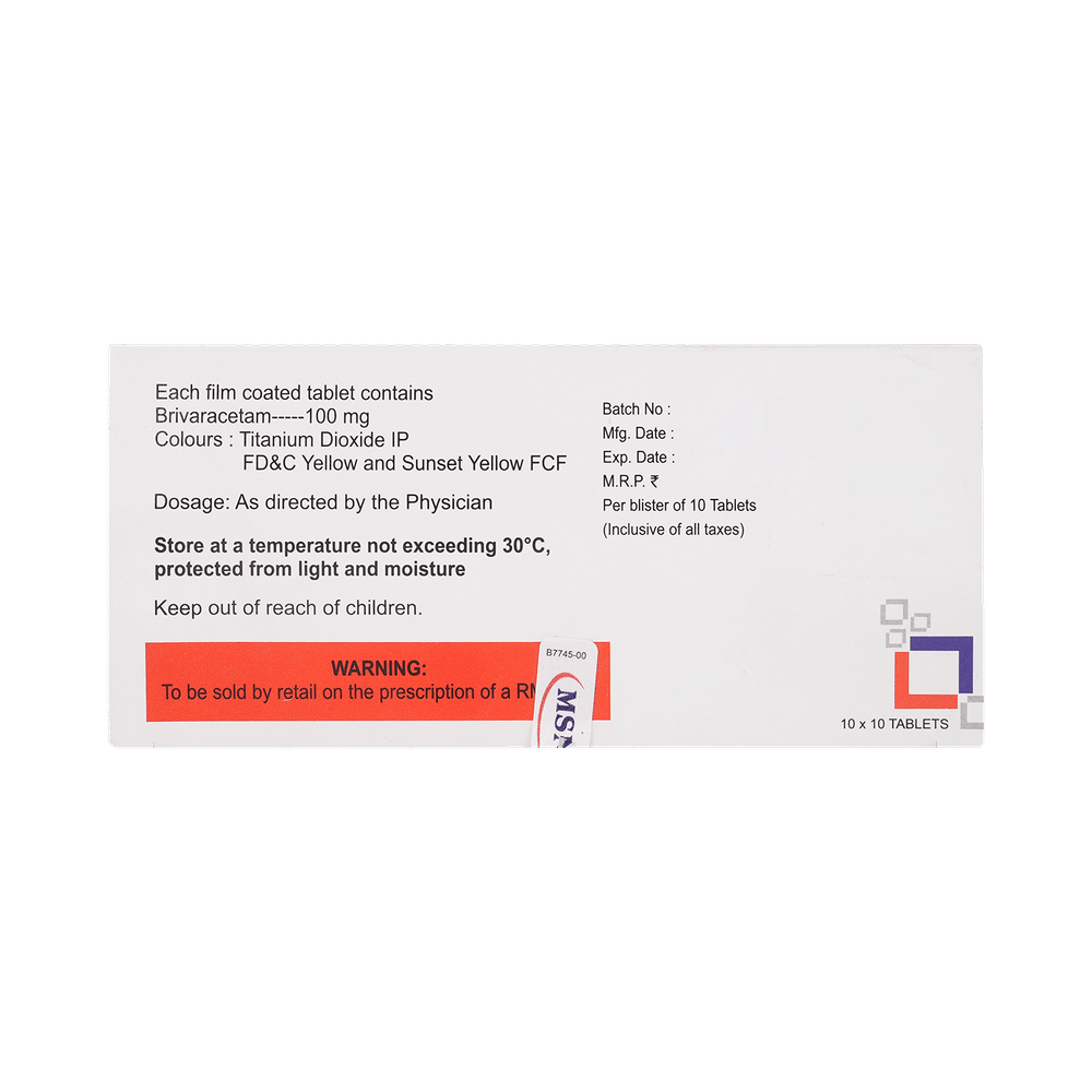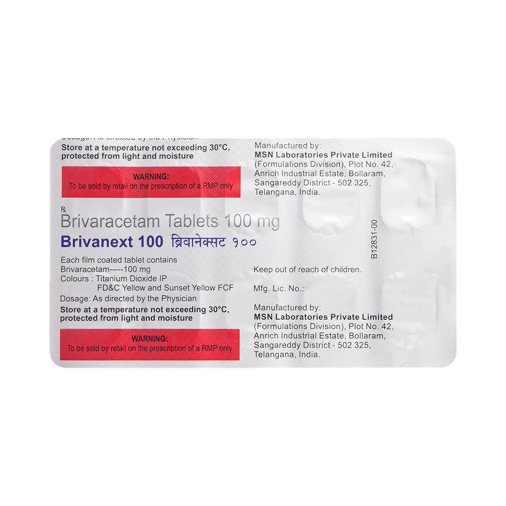 Brivanext 100mg Tablet is an anti-epileptic medicine used to treat seizures (fits) in epilepsy. It can be used alone or along with other medicines. It helps to prevent seizures for as long as you continue to take it. Brivanext 100mg Tablet suppresses the abnormal electrical activity in the brain. You can take it regularly with or without food but try to take it at the same time each day to get the most benefit. The dose and how often you need it will be decided by your doctor so that you get the right amount to control your seizures. It may be increased gradually.It is generally advised as a long-term treatment. You should continue taking it for as long as your doctor has told you to, even if you feel well. If you stop or miss doses your seizures could get worse. Do not stop taking this medicine unless your doctor tells you to. This is because stopping the medicine suddenly could make your seizures worse.Some common side effects of this medicine include dizziness, headache, nausea, and vomiting. You may also experience behavioral changes, aggressive behavior, irritation, agitation, etc. Side effects are more common during the first few weeks and usually lessen as your body gets used to the medicine. Most of these side effects do not need medical attention, but some of them can be serious. A small number of people being treated with this medicine have had thoughts of harming or killing themselves. Contact your doctor if your mood changes for the worse.Before taking it, you should tell your doctor if you have liver or kidney-related problems, depression, or suicidal thoughts, and if you are pregnant or planning to become pregnant. Breastfeeding mothers should also consult their doctor before taking this medicine.