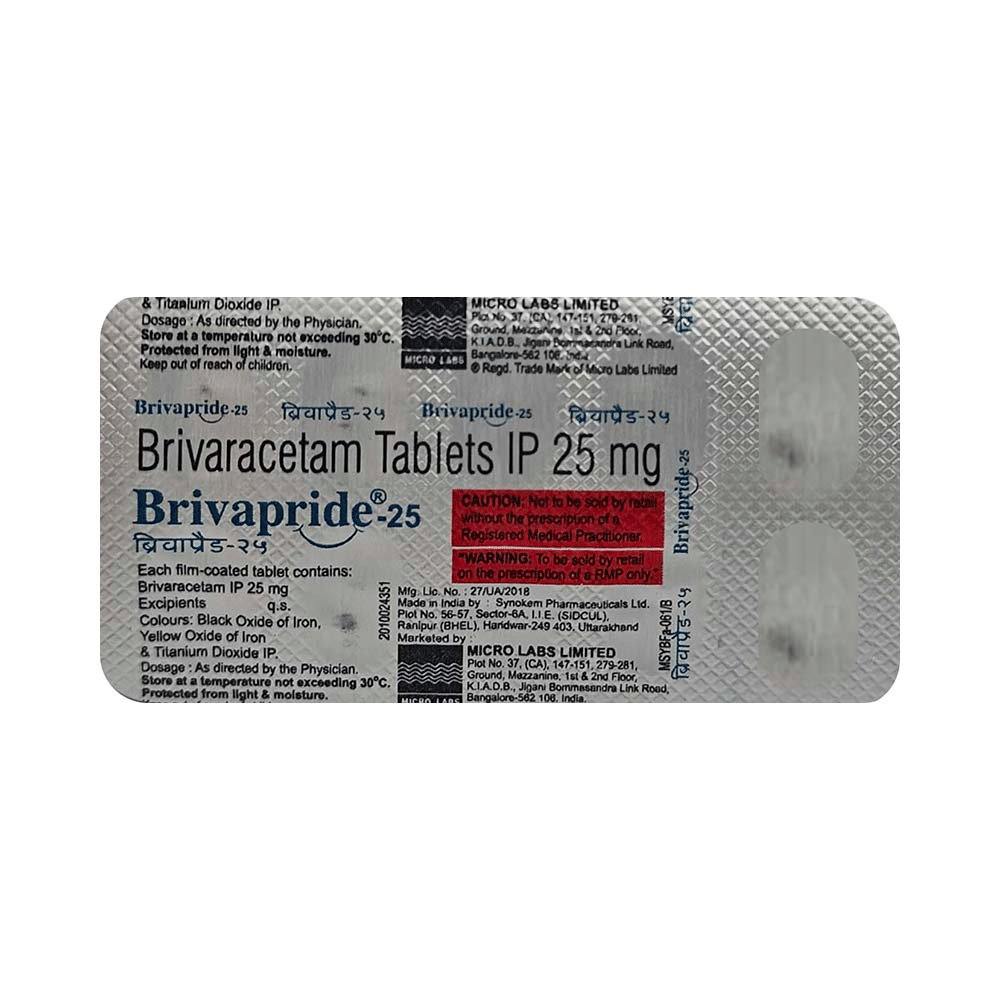 BRIVApride 25mg Tablet is an anti-epileptic medicine used to treat seizures (fits) in epilepsy. It can be used alone or along with other medicines. It helps to prevent seizures for as long as you continue to take it. BRIVApride 25mg Tablet suppresses the abnormal electrical activity in the brain. You can take it regularly with or without food but try to take it at the same time each day to get the most benefit. The dose and how often you need it will be decided by your doctor so that you get the right amount to control your seizures. It may be increased gradually.It is generally advised as a long-term treatment. You should continue taking it for as long as your doctor has told you to, even if you feel well. If you stop or miss doses your seizures could get worse. Do not stop taking this medicine unless your doctor tells you to. This is because stopping the medicine suddenly could make your seizures worse.Some common side effects of this medicine include dizziness, headache, nausea, and vomiting. You may also experience behavioral changes, aggressive behavior, irritation, agitation, etc. Side effects are more common during the first few weeks and usually lessen as your body gets used to the medicine. Most of these side effects do not need medical attention, but some of them can be serious. A small number of people being treated with this medicine have had thoughts of harming or killing themselves. Contact your doctor if your mood changes for the worse.Before taking it, you should tell your doctor if you have liver or kidney-related problems, depression, or suicidal thoughts, and if you are pregnant or planning to become pregnant. Breastfeeding mothers should also consult their doctor before taking this medicine.