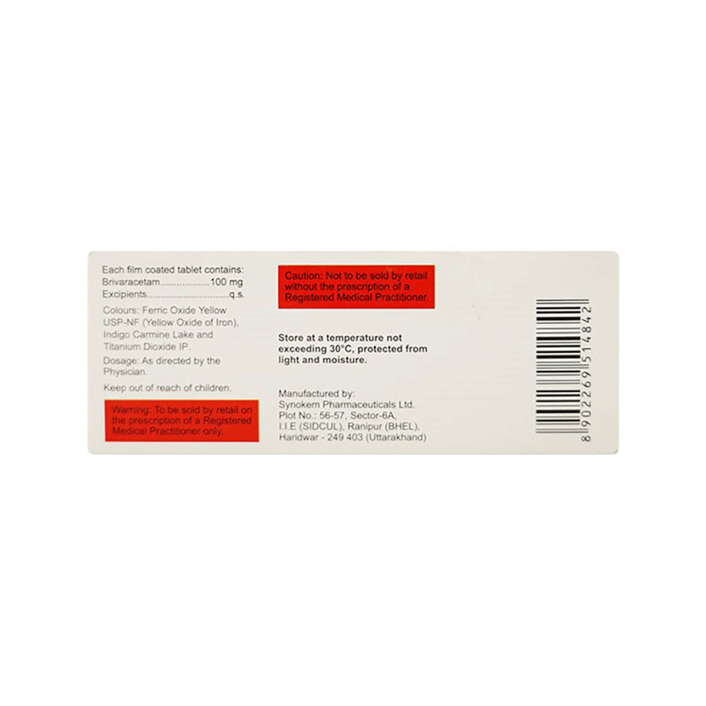 BRIVAsure 100mg Tablet is an anti-epileptic medicine used to treat seizures (fits) in epilepsy. It can be used alone or along with other medicines. It helps to prevent seizures for as long as you continue to take it. BRIVAsure 100mg Tablet suppresses the abnormal electrical activity in the brain. You can take it regularly with or without food but try to take it at the same time each day to get the most benefit. The dose and how often you need it will be decided by your doctor so that you get the right amount to control your seizures. It may be increased gradually.It is generally advised as a long-term treatment. You should continue taking it for as long as your doctor has told you to, even if you feel well. If you stop or miss doses your seizures could get worse. Do not stop taking this medicine unless your doctor tells you to. This is because stopping the medicine suddenly could make your seizures worse.Some common side effects of this medicine include dizziness, headache, nausea, and vomiting. You may also experience behavioral changes, aggressive behavior, irritation, agitation, etc. Side effects are more common during the first few weeks and usually lessen as your body gets used to the medicine. Most of these side effects do not need medical attention, but some of them can be serious. A small number of people being treated with this medicine have had thoughts of harming or killing themselves. Contact your doctor if your mood changes for the worse.Before taking it, you should tell your doctor if you have liver or kidney-related problems, depression, or suicidal thoughts, and if you are pregnant or planning to become pregnant. Breastfeeding mothers should also consult their doctor before taking this medicine.