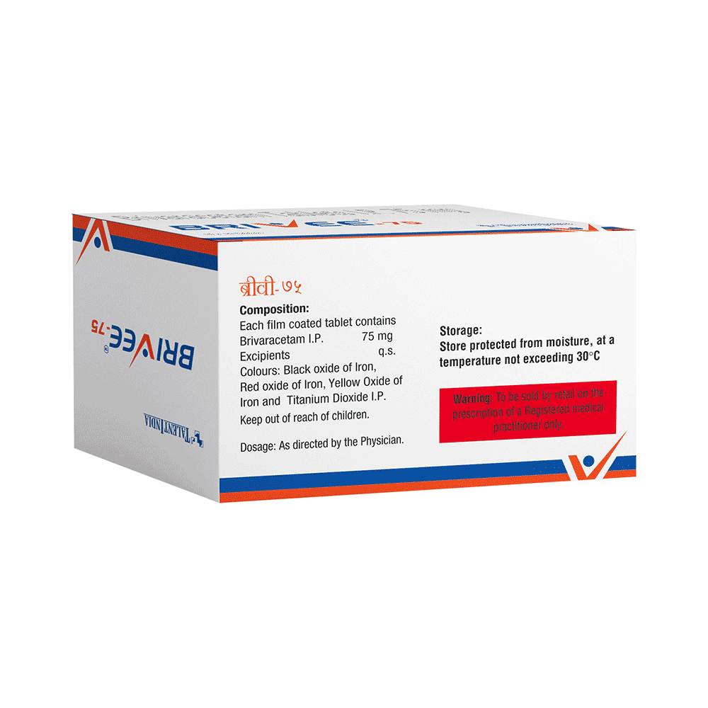 Brivee 75 Tablet is an anti-epileptic medicine used to treat seizures (fits) in epilepsy. It can be used alone or along with other medicines. It helps to prevent seizures for as long as you continue to take it. Brivee 75 Tablet suppresses the abnormal electrical activity in the brain. You can take it regularly with or without food but try to take it at the same time each day to get the most benefit. The dose and how often you need it will be decided by your doctor so that you get the right amount to control your seizures. It may be increased gradually.It is generally advised as a long-term treatment. You should continue taking it for as long as your doctor has told you to, even if you feel well. If you stop or miss doses your seizures could get worse. Do not stop taking this medicine unless your doctor tells you to. This is because stopping the medicine suddenly could make your seizures worse.Some common side effects of this medicine include dizziness, headache, nausea, and vomiting. You may also experience behavioral changes, aggressive behavior, irritation, agitation, etc. Side effects are more common during the first few weeks and usually lessen as your body gets used to the medicine. Most of these side effects do not need medical attention, but some of them can be serious. A small number of people being treated with this medicine have had thoughts of harming or killing themselves. Contact your doctor if your mood changes for the worse.Before taking it, you should tell your doctor if you have liver or kidney-related problems, depression, or suicidal thoughts, and if you are pregnant or planning to become pregnant. Breastfeeding mothers should also consult their doctor before taking this medicine.