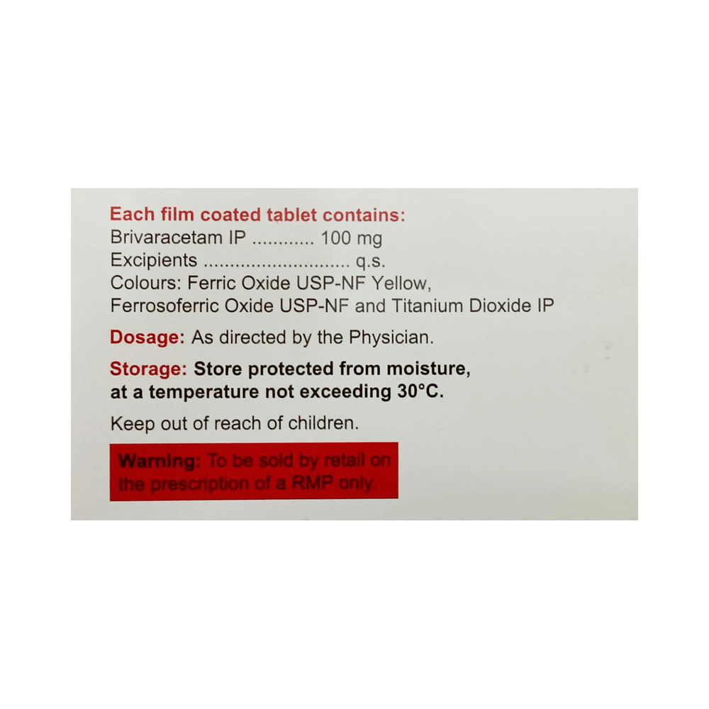 Brivepsy 100mg Tablet is an anti-epileptic medicine used to treat seizures (fits) in epilepsy. It can be used alone or along with other medicines. It helps to prevent seizures for as long as you continue to take it. Brivepsy 100mg Tablet suppresses the abnormal electrical activity in the brain. You can take it regularly with or without food but try to take it at the same time each day to get the most benefit. The dose and how often you need it will be decided by your doctor so that you get the right amount to control your seizures. It may be increased gradually.It is generally advised as a long-term treatment. You should continue taking it for as long as your doctor has told you to, even if you feel well. If you stop or miss doses your seizures could get worse. Do not stop taking this medicine unless your doctor tells you to. This is because stopping the medicine suddenly could make your seizures worse.Some common side effects of this medicine include dizziness, headache, nausea, and vomiting. You may also experience behavioral changes, aggressive behavior, irritation, agitation, etc. Side effects are more common during the first few weeks and usually lessen as your body gets used to the medicine. Most of these side effects do not need medical attention, but some of them can be serious. A small number of people being treated with this medicine have had thoughts of harming or killing themselves. Contact your doctor if your mood changes for the worse.Before taking it, you should tell your doctor if you have liver or kidney-related problems, depression, or suicidal thoughts, and if you are pregnant or planning to become pregnant. Breastfeeding mothers should also consult their doctor before taking this medicine.