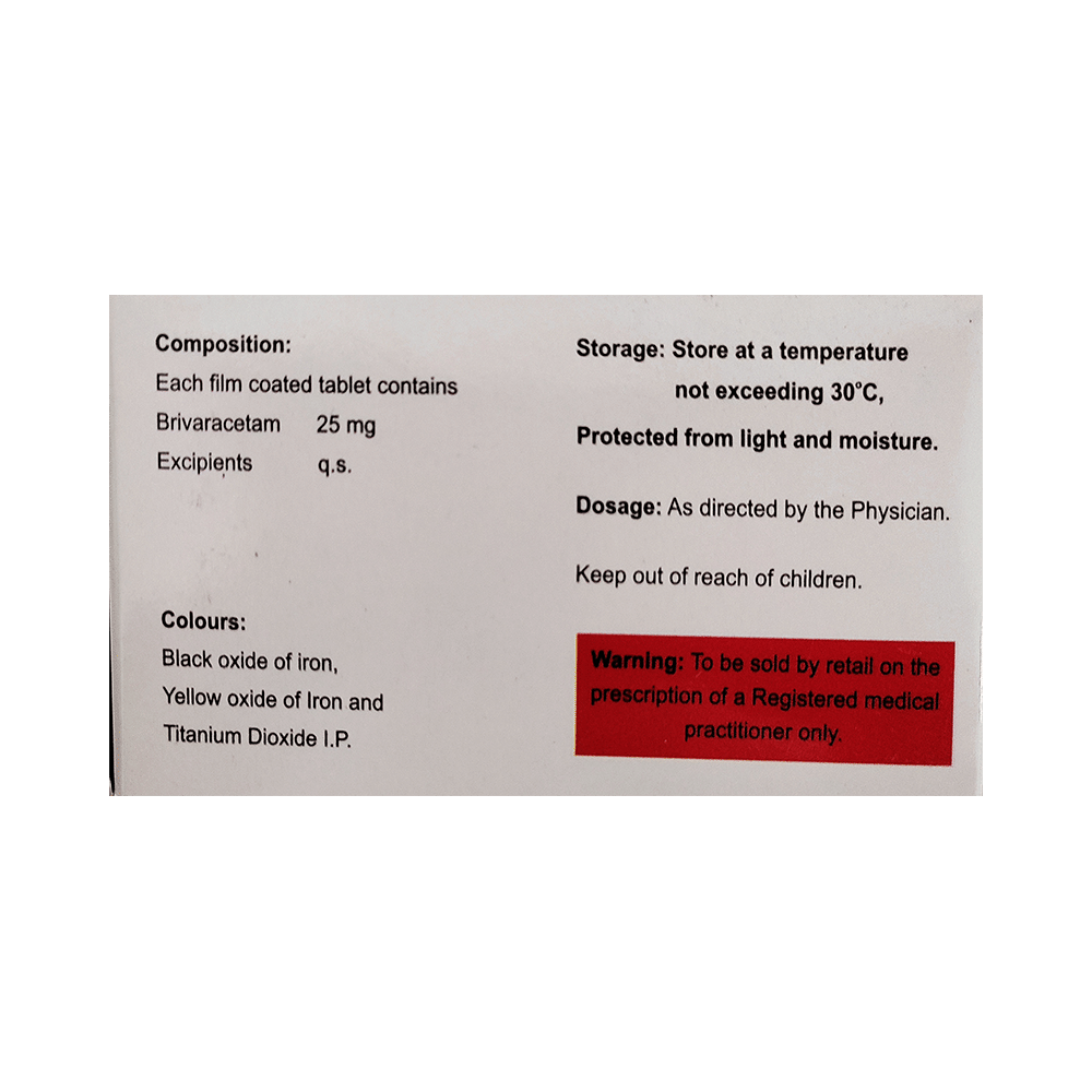 Brivissa 25 Tablet is an anti-epileptic medicine used to treat seizures (fits) in epilepsy. It can be used alone or along with other medicines. It helps to prevent seizures for as long as you continue to take it. Brivissa 25 Tablet suppresses the abnormal electrical activity in the brain. You can take it regularly with or without food but try to take it at the same time each day to get the most benefit. The dose and how often you need it will be decided by your doctor so that you get the right amount to control your seizures. It may be increased gradually.It is generally advised as a long-term treatment. You should continue taking it for as long as your doctor has told you to, even if you feel well. If you stop or miss doses your seizures could get worse. Do not stop taking this medicine unless your doctor tells you to. This is because stopping the medicine suddenly could make your seizures worse.Some common side effects of this medicine include dizziness, headache, nausea, and vomiting. You may also experience behavioral changes, aggressive behavior, irritation, agitation, etc. Side effects are more common during the first few weeks and usually lessen as your body gets used to the medicine. Most of these side effects do not need medical attention, but some of them can be serious. A small number of people being treated with this medicine have had thoughts of harming or killing themselves. Contact your doctor if your mood changes for the worse.Before taking it, you should tell your doctor if you have liver or kidney-related problems, depression, or suicidal thoughts, and if you are pregnant or planning to become pregnant. Breastfeeding mothers should also consult their doctor before taking this medicine.