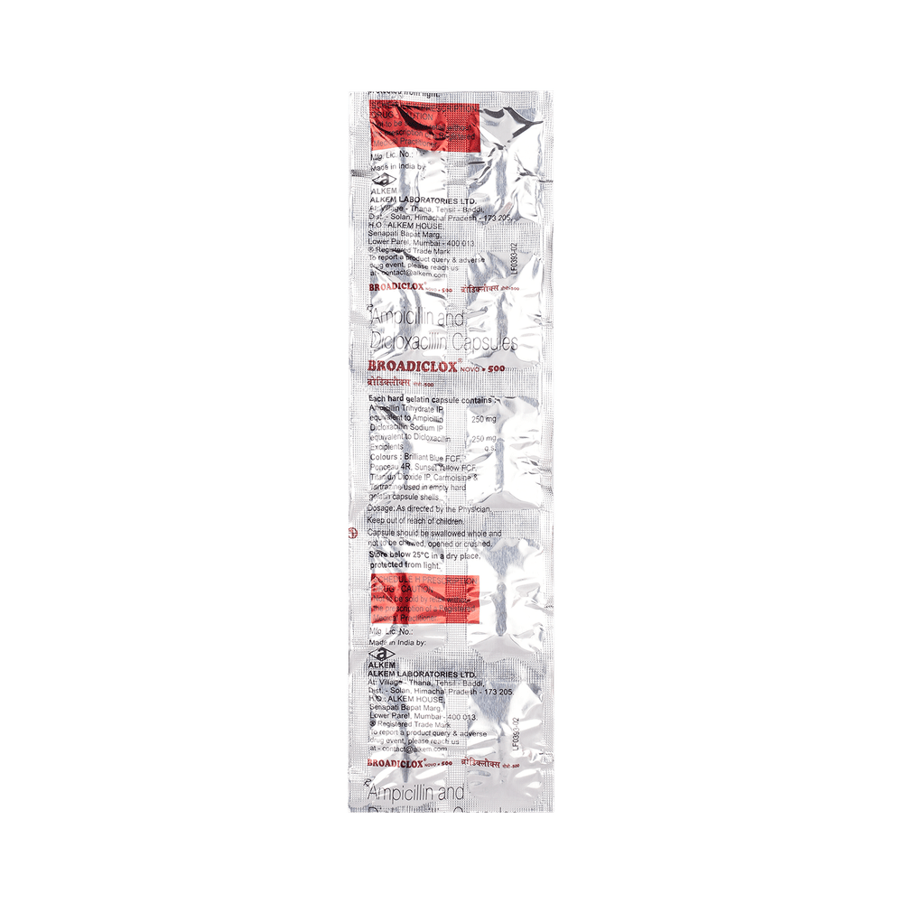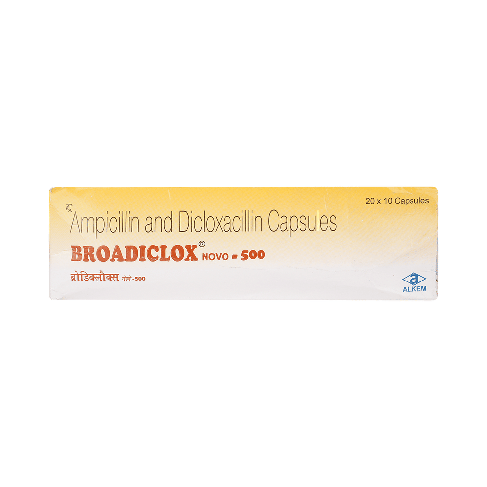 Broadiclox Novo 500 mg Capsule is a combination medicine that is used to treat various types of bacterial infections. It fights against the microorganisms to prevent their growth and further spread of the infection. Broadiclox Novo 500 mg Capsule is a prescription medicine. It is advised to take it as per the prescription. It can be taken with or without food, but it must be taken at a fixed time to ensure better efficacy. Do not consume more than the recommended dose, as this may have harmful effects on your body. If you miss a dose, take it as soon as you remember. The course of the treatment must be completed even if you feel better. Sudden discontinuation of the treatment may affect the potency of the medicine.Some common side effects of this medicine are nausea, vomiting, diarrhea, indigestion, etc. If any of the side effects get aggravated, you must consult your doctor immediately. If you experience any allergic reaction (rashes, itching, swelling, shortness of breath, etc.), you must seek immediate medical help.Before taking this medicine, you should tell your doctor if you are taking any medicines for any health condition. Pregnant or breastfeeding women should also consult with their doctor before taking it. Avoid drinking alcohol as it can cause excessive drowsiness with this medicine. It usually does not impair your ability to drive, but you should not drive if it makes you feel sleepy or dizzy. You must take adequate rest for a faster recovery, also take a healthy diet and drink plenty of water. Your doctor may ask for a few laboratory and diagnostic tests to know the effects of the medicine on your body.