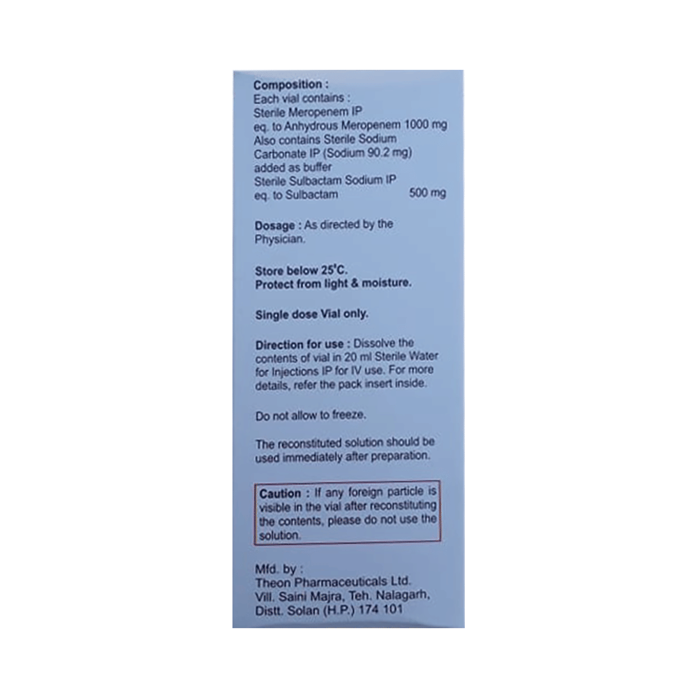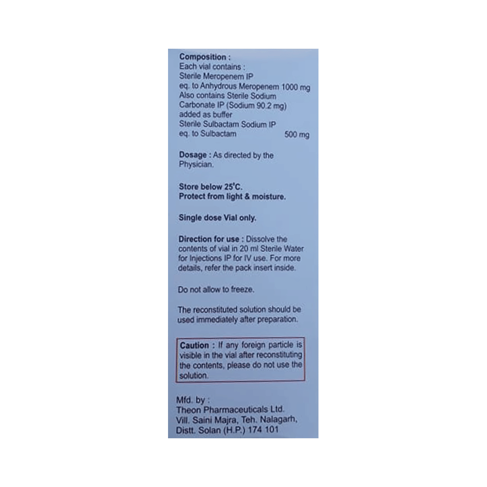 Salt Composition: Meropenem (1000mg) + Sulbactam (500mg)