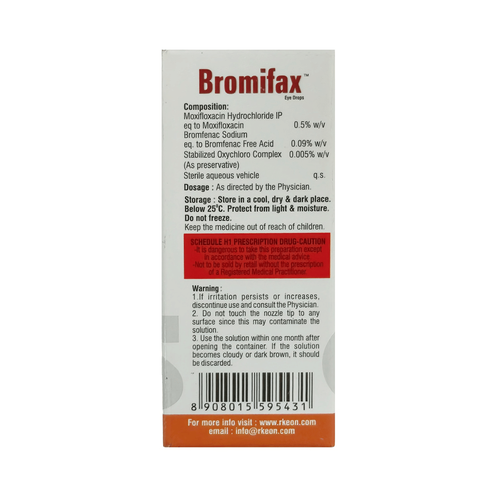 Bromifax Eye Drop is a prescription medicine used in the treatment of bacterial eye infections. It helps in relieving pain, itching, discomfort, pain, and irritation caused by the infection. It is also used to relieve postoperative pain, swelling, and redness. Bromifax Eye Drop is to be used only in the affected eye in the dose and duration as advised by the doctor. Wash your hands before using this medicine. It is advised to check the label for directions before use. Do not skip any doses and finish the full course of treatment even if you feel better. Stopping the medicine too early may lead to the infection returning or worsening.Use of this medicine may cause eye irritation, eye discomfort, and burning sensation at the application site. These are usually temporary and resolve with time. However, if they persist or get worse, inform your doctor. In case of accidental contact with your ears, nose, or mouth, immediately rinse it with water.Inform your doctor if you have a known allergy to any of the ingredients in this medicine or if you are taking any other medication. It is advised not to drive or operate heavy machinery immediately after using this medicine as it may cause temporary blurring of vision and may affect your ability to drive.