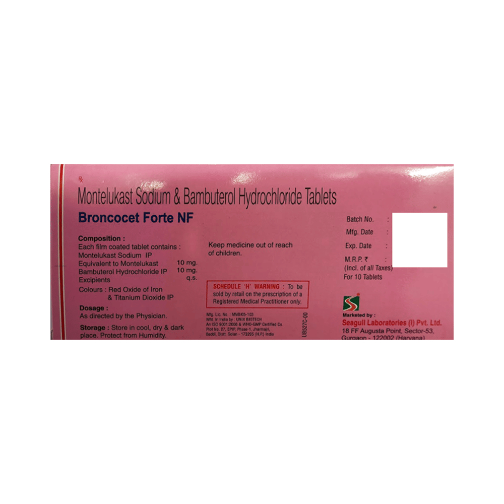 In Treatment of AsthmaBroncocet-Forte NF Tablet is a combination medicine that works by reducing and preventing swelling and inflammation in the lungs. It prevents the symptoms of asthma, such as tightness in chest, wheezing, breathlessness, and coughing. This allows you to carry out daily activities more easily and confidently.It may take a few weeks for Broncocet-Forte NF Tablet to show full effects. Keep taking it regularly as prescribed even if you do not have any symptoms (this means it is working). Do not stop taking it unless the doctor advises you to, otherwise you are more likely to suffer from symptoms. This medicine will not stop an asthma attack that has already started.