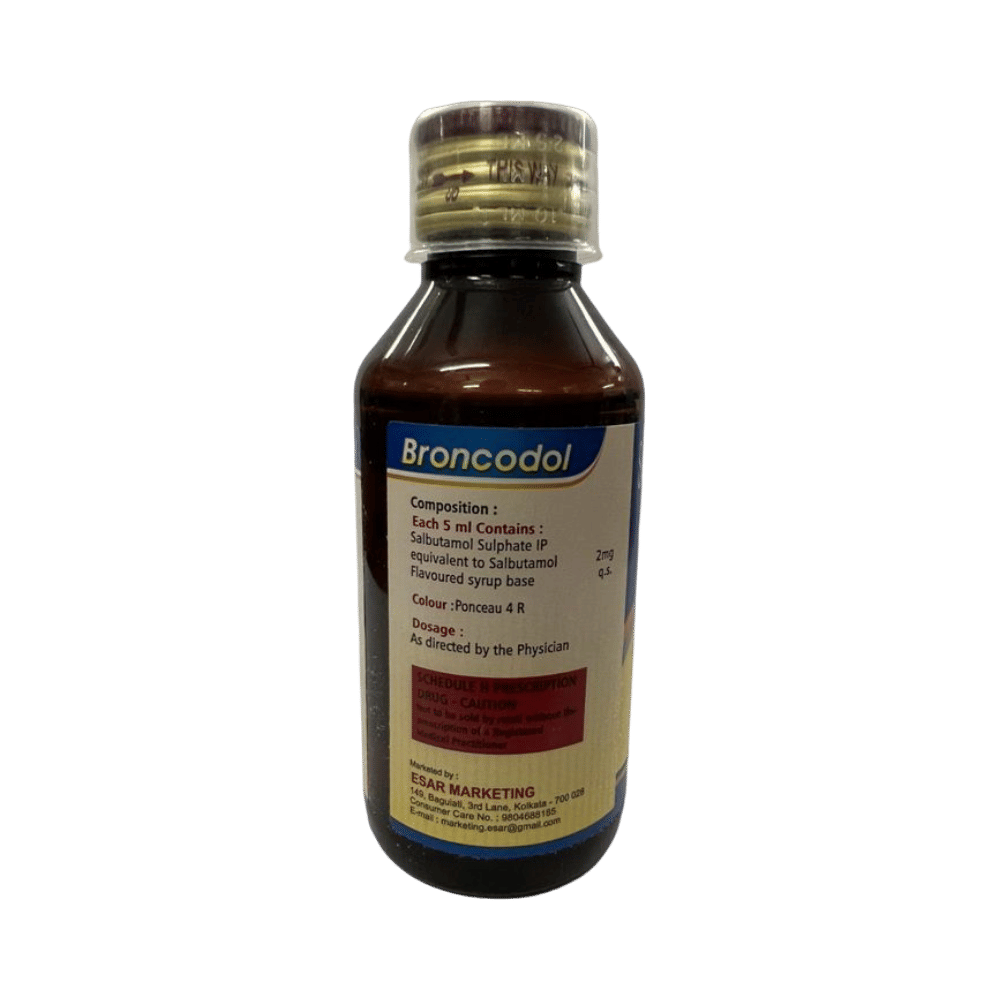 Broncodol Syrup is used to relieve symptoms of asthma and chronic obstructive pulmonary diseases (COPD) such as coughing, wheezing, and breathlessness. It helps in relaxing the muscles of the air passages, thus widening it and making it easier to breathe. You can take Broncodol Syrup with or without food. The dose will depend on your condition and how you respond to the medicine. Try to take it at the same time each day. It is important to keep taking this medicine until your doctor tells you not to. Use this medicine regularly to get the most benefit from it even if you feel well.This medicine is generally safe however it may cause tremors, headaches, palpitation, fast heart rate, nervousness, and muscle cramps in some people. These are often not dangerous and should gradually improve as your body gets used to the medicine. There are other, rarer, side effects and you should call your doctor straight away if you get chest pain, a very bad headache, or very bad dizziness.Before using this medicine, you should tell your doctor if you have high blood pressure, an overactive thyroid gland, a history of heart problems, diabetes, or low levels of potassium in your blood to make sure it is safe. Also, make sure your doctor knows if you are pregnant or breastfeeding before taking this medicine. This medicine can make you feel dizzy or shaky so avoid driving, cycling, or using tools or machinery until you feel better. You should not smoke as it causes damage to your lungs and will make your condition worse.