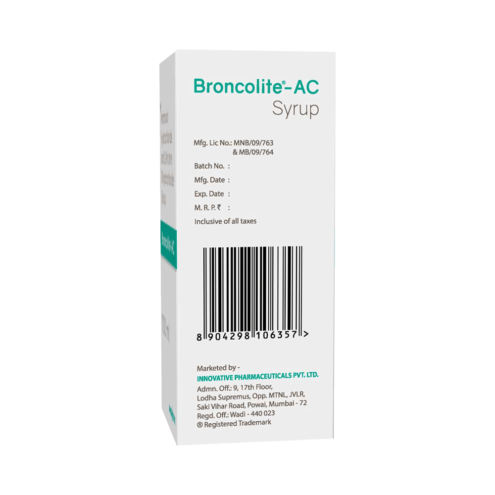 Broncolite-AC Syrup is a combination medicine used in the treatment of cough. It relieves allergic symptoms such as sneezing, running nose, watery eyes, itching, swelling, and congestion or stiffness. It also thins and loosens mucus, making it easier to cough out. Broncolite-AC Syrup is taken with or without food in a dose and duration as advised by the doctor. The dose you are given will depend on your condition and how you respond to the medicine. You should keep taking this medicine for as long as your doctor recommends. If you stop treatment too early your symptoms may come back and your condition may worsen. Let your doctor know about all other medications you are taking as some may affect, or be affected by this medicine.The most common side effects are stomach upset, dryness in mouth, fatigue, sedation, and allergic reaction. Most of these are temporary and usually resolve with time. Contact your doctor straight away if you are at all concerned about any of these side effects. This medicine can also cause dizziness and sleepiness, so do not drive or do anything that requires mental focus until you know how this medicine affects you. Avoid drinking alcohol while taking this medicine as it can make dizziness worse.Never support self-medication or recommend your medicine to another person. It is beneficial to have plenty of fluids while taking this medication. Before taking it, you should tell your doctor if you have any kidney and liver diseases. Pregnant or breastfeeding women should also consult their doctor before taking this medicine.