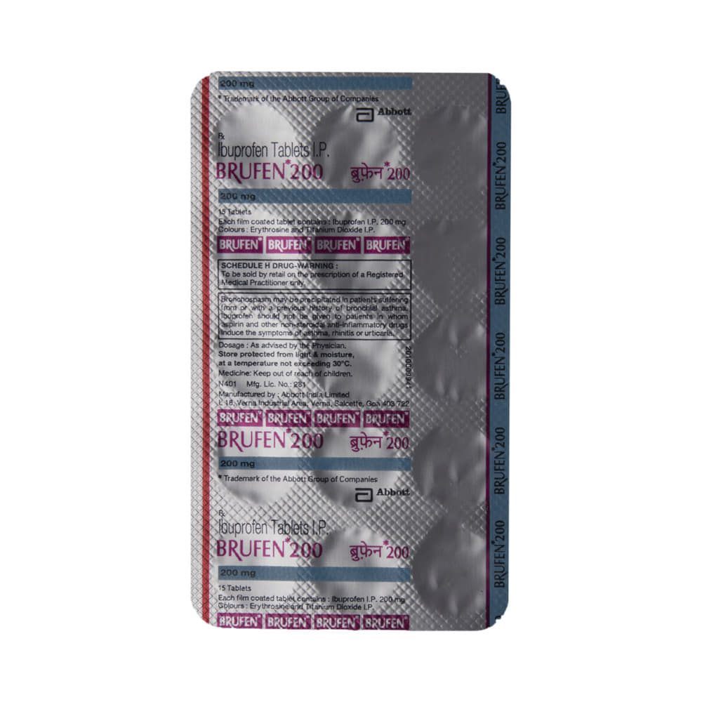 Brufen 200 Tablet is a pain-relieving medicine. It is used to treat many conditions such as headache, fever, period pain, toothache, colds, and mild arthritis. It is also a common ingredient in many cold and flu remedies. Brufen 200 Tablet should be taken with food to avoid stomach upset and reduce side effects. In general, you should try to use the smallest amount necessary to control your symptoms, for the shortest possible time. You should take this medicine regularly while you need it. Try not to miss doses as it will become less effective if you do.The medicine is well tolerated with little or no side effects. However, it may cause vomiting, stomach pain, nausea, and indigestion in some people. If any of these side effects do not resolve with time or get worse, you should let your doctor know. Your doctor may be able to suggest ways of preventing or reducing the symptoms.This medicine is widely prescribed and considered safe but is not suitable for everybody. Before you take it, you should tell your doctor if you have kidney problems, asthma, blood disorders, or drink a lot of alcohol. Also, tell your doctor what other medicines you are taking to make sure you are safe. It is best to avoid drinking alcohol while using this medicine.