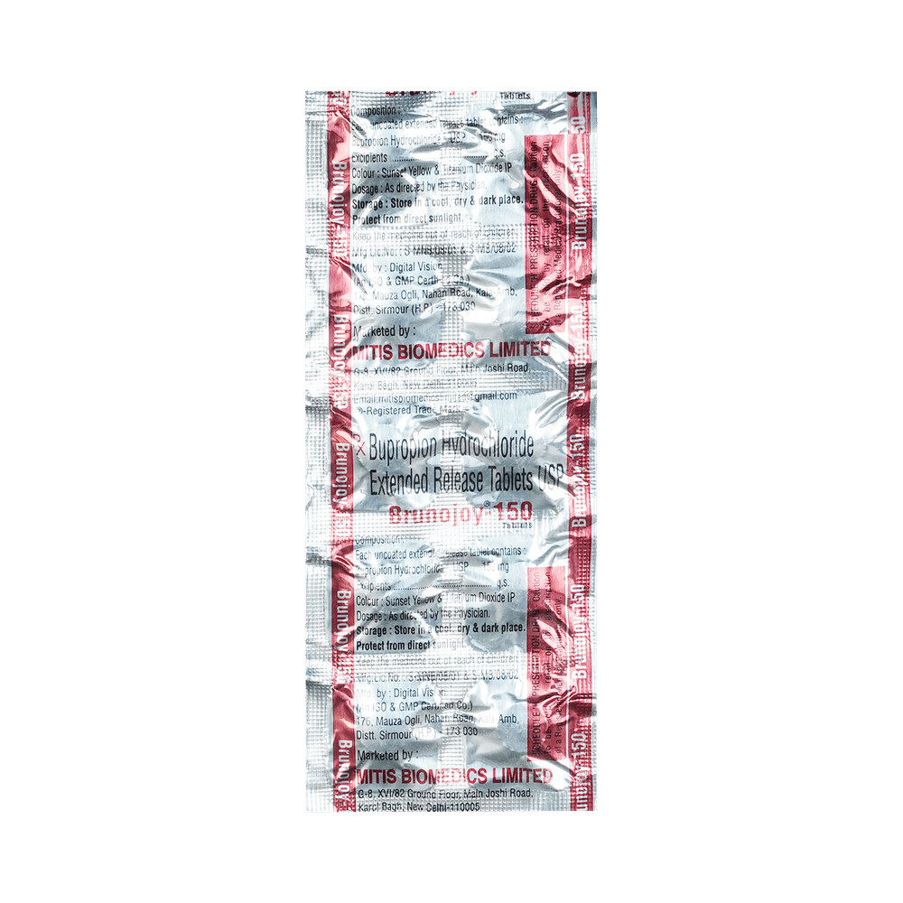 Brunojoy 150 Tablet ER is used in the treatment of depression and smoking addiction. This medicine helps by increasing the level of chemical messengers in the brain that relax the nerves and have a calming effect on the brain. Brunojoy 150 Tablet ER may be taken with or without food. It is advised to take this medicine at a fixed time each day. You should never skip any doses and finish the full course of treatment even if you feel better. This medication mustn't be stopped suddenly as it may worsen your symptoms.Some common side effects of this medicine include insomnia (difficulty sleeping), allergic reaction, impaired concentration, sweating, headache, nausea, vomiting, and dry mouth. It even causes dizziness and sleepiness, so do not drive or do anything that requires mental focus. Moreover, most of the side effects are immediate and often go away with time. Please consult your doctor if these bother you or do not go away.Before taking this medicine it is important to inform your doctor if you have any history of seizure or if you drink alcohol. Inform your doctor if you develop any unusual mood changes or if you have any suicidal thoughts.