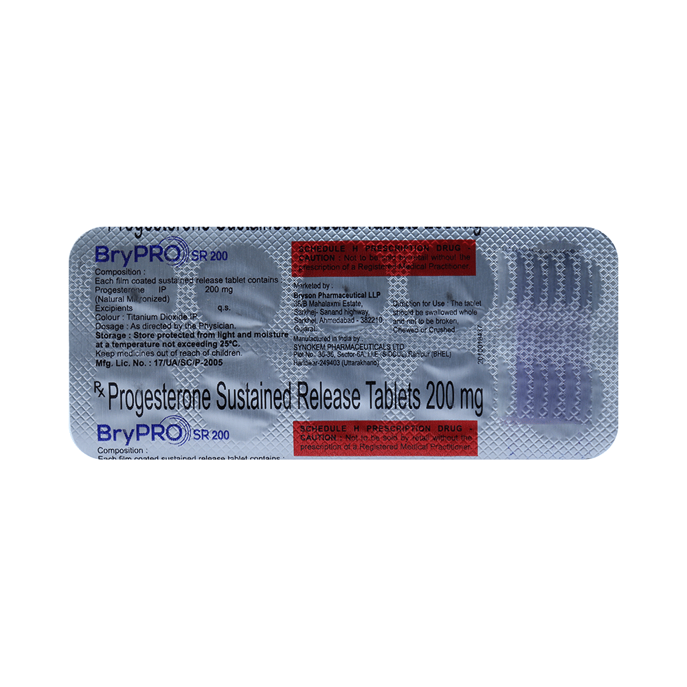 Brypro SR 200 Tablet is a natural female sex hormone, progesterone. It is used to treat menstrual and pregnancy-related issues that are caused by hormonal imbalance. Brypro SR 200 Tablet is also prescribed, along with estrogen, as a part of hormonal replacement therapy for preventing endometrial hyperplasia (thickening of the lining of the uterus). It should be taken with food. It should be taken at the same time each day to get the most benefit. You should continue taking it for as long as your doctor has told you to, even if you feel well.The most common side effects include headache, breast pain, irregular vaginal bleeding or spotting, stomach or abdominal cramps, bloating, nausea and vomiting, hair loss, edema, and vaginal yeast infection. Side effects are more common during the first few weeks and usually lessen as your body gets used to the medicine. You may also experience bleeding or spotting between your periods; consult with your doctor if it happens frequently.Before taking this medicine, inform your doctor if you have, or have had, breast cancer, unusual bleeding in the vagina, or liver disease. You will probably have several tests both before and during treatment to check your womb. Also, tell your doctor what other medicines you are taking, as some may affect, or be affected by, this medicine. In general, it is advisable to avoid alcohol and smoking.