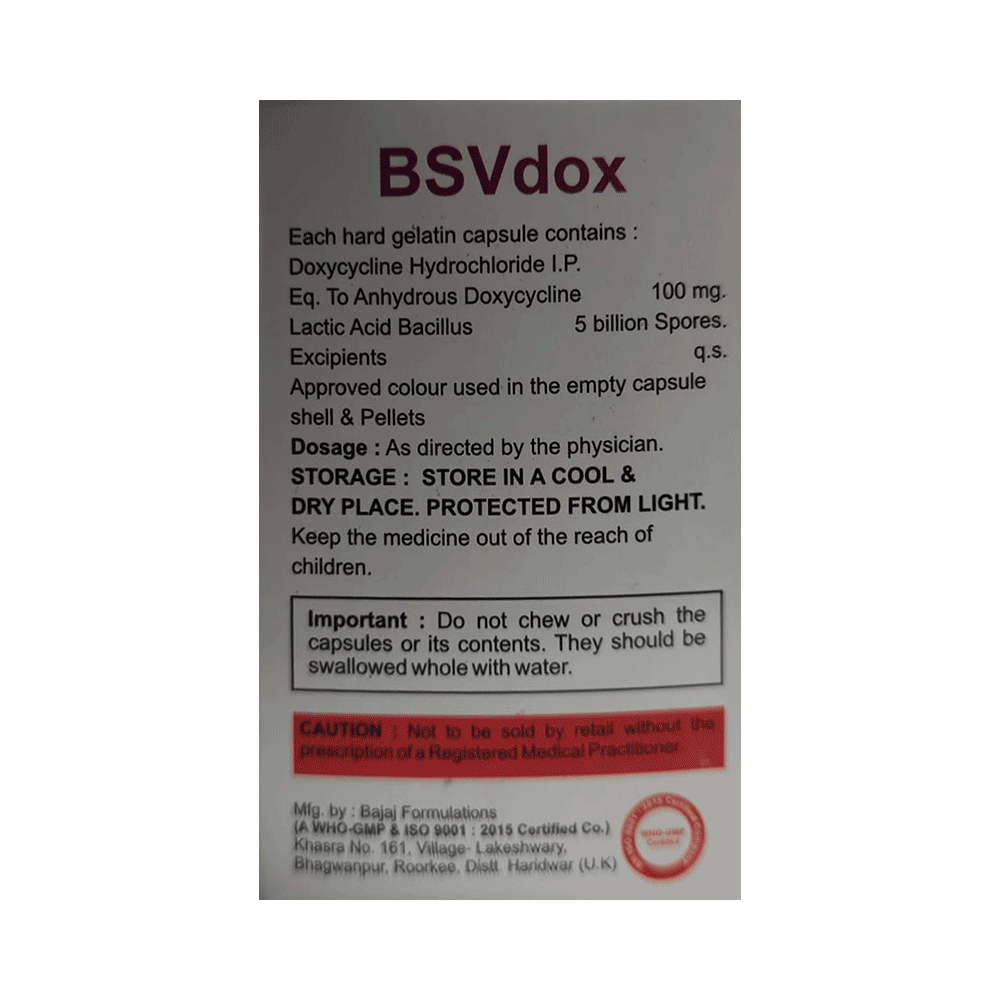 Bsvdox Capsule is a combination of two medicines: Doxycycline and Lactobacillus.