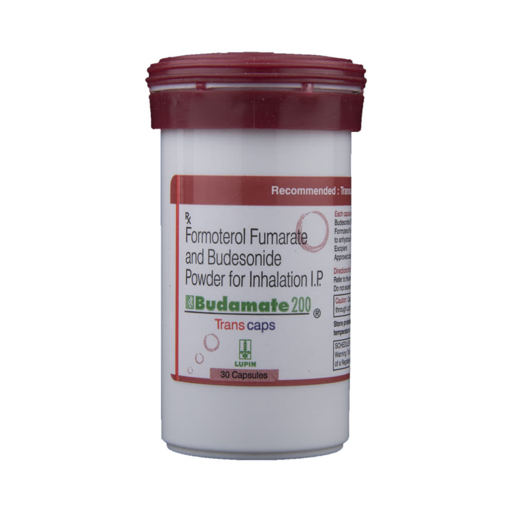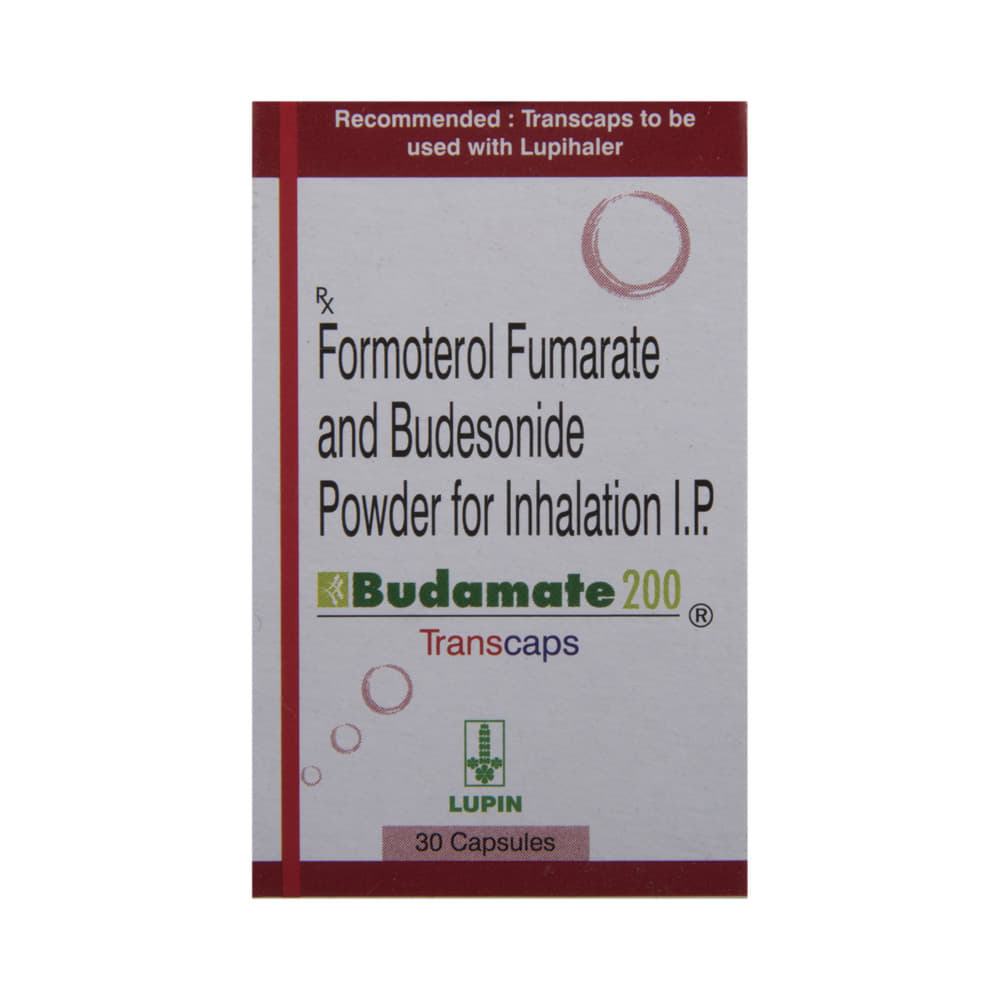 budaMATE 200 Transcaps is a combination of two medicines in one inhaler. It relieves the long-term symptoms of asthma and COPD, making breathing easier. It works by inhibiting the release of certain chemical messengers that cause inflammation (swelling) and relaxes the muscles in the airways. Your doctor will tell you how often you need to use your inhaler. The effect of this medicine may be noticeable after a few days but will only reach its maximum after a few weeks. This medicine must be used regularly to be effective, so go on taking it even if you don't have any symptoms. That means it’s doing its job. If you stop taking it your symptoms may get worse. This medicine should not be used to relieve sudden shortness of breath. If sudden shortness of breath occurs, use your rescue inhaler. To get the benefit from this medicine you need to make sure you get your inhaler technique right, otherwise, it does not work as well.The most common side effects include headache, nausea, vomiting, stomach discomfort, and respiratory tract infection. If you get there, don’t stop taking it but do talk to your doctor. You can prevent some of these symptoms by rinsing your mouth and throat with water or brushing your teeth after using your inhaler. There are other, rarer side effects which can be serious. Talk to your doctor if you're worried about them.Before taking it, you should tell your doctor if you have any kidney or liver diseases so that your doctor can prescribe a suitable dose for you. You should also tell your doctor if you are pregnant, planning pregnancy or breastfeeding.