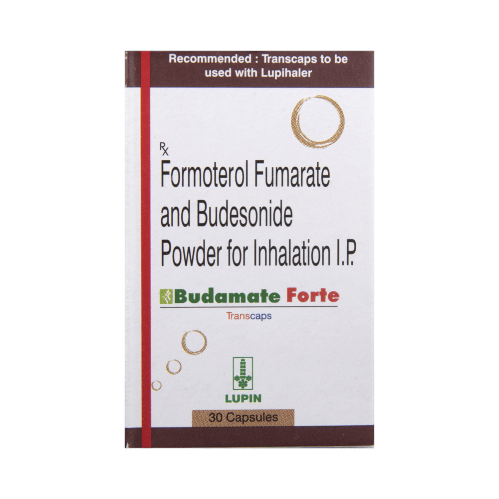 budaMATE Forte Transcaps is a combination of two medicines in one inhaler. It relieves the long-term symptoms of asthma and COPD, making breathing easier. It works by inhibiting the release of certain chemical messengers that cause inflammation (swelling) and relaxes the muscles in the airways. Your doctor will tell you how often you need to use your inhaler. The effect of this medicine may be noticeable after a few days but will only reach its maximum after a few weeks. This medicine must be used regularly to be effective, so go on taking it even if you don't have any symptoms. That means it’s doing its job. If you stop taking it your symptoms may get worse. This medicine should not be used to relieve sudden shortness of breath. If sudden shortness of breath occurs, use your rescue inhaler. To get the benefit from this medicine you need to make sure you get your inhaler technique right, otherwise, it does not work as well.The most common side effects include headache, nausea, vomiting, stomach discomfort, and respiratory tract infection. If you get there, don’t stop taking it but do talk to your doctor. You can prevent some of these symptoms by rinsing your mouth and throat with water or brushing your teeth after using your inhaler. There are other, rarer side effects which can be serious. Talk to your doctor if you're worried about them.Before taking it, you should tell your doctor if you have any kidney or liver diseases so that your doctor can prescribe a suitable dose for you. You should also tell your doctor if you are pregnant, planning pregnancy or breastfeeding.