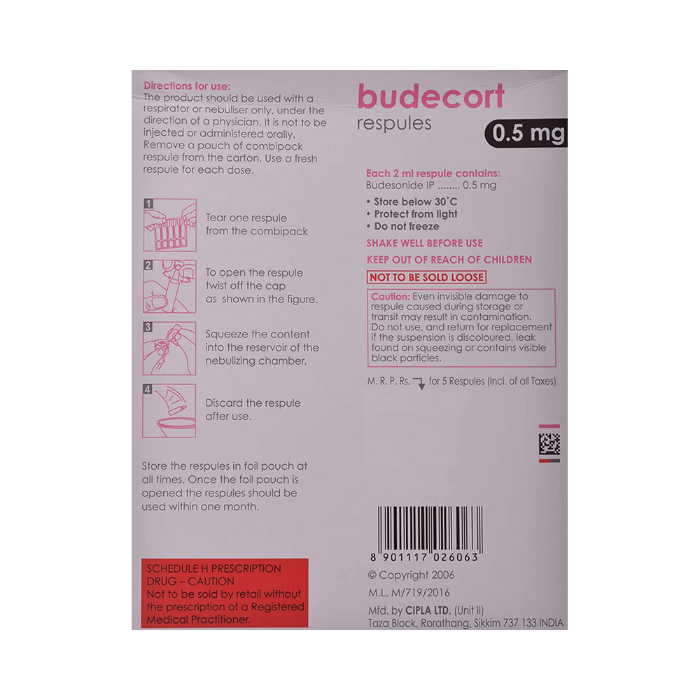 BUDEcort 0.5mg Respules (2ml Each) is used to prevent the symptoms of asthma (wheezing and shortness of breath). It is a steroid and is known as a "preventer". You need to have a fast-acting “reliever” as well because this medicine will not stop an asthma attack that has already started. Your doctor will tell you how often you need to use BUDEcort 0.5mg Respules (2ml Each). It is important that you take the lowest dose needed to effectively control your asthma. The effect of this medicine may be noticeable after a few days but will only reach its maximum after a few weeks. This medicine must be used regularly to be effective, so go on taking it even if you do not have any symptoms. No symptoms mean that the medicine is doing its job. If you stop taking it your asthma may get worse. It should not be used to relieve sudden asthma attacks. If an asthma attack occurs, use your quick-relief inhaler "reliever". To get the benefit from this medicine you need to make sure you get your inhaler technique right, otherwise, it will not work as well.The most common side effects are irritation in the throat, difficulty swallowing, headache, and indigestion. If you get these, do not stop taking it but do talk to your doctor. You can help prevent these symptoms by rinsing your mouth and throat with water or brushing your teeth after using your inhaler. There are other rare, side effects that can be serious. Talk to your doctor if you are worried about them. In general, you should be trying to avoid situations that make your asthma worse (your triggers) and try not to smoke.Before taking BUDEcort 0.5mg Respules (2ml Each), you should tell your doctor if you have tuberculosis, any infections in your mouth or lungs, or liver disease. While taking it you may be more at risk of getting infections so stay away from people with colds and flu. If you use BUDEcort 0.5mg Respules (2ml Each) for a long time it may cause weak bones (osteoporosis) and damage to your eyes (glaucoma or cataracts). You might need tests for bone density and eye pressure. Ask your doctor whether it’s safe to take this medicine if you are pregnant or breastfeeding.