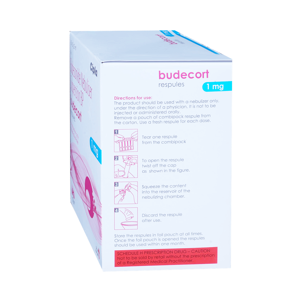 BUDEcort 1mg Respules (2ml Each) is used to prevent the symptoms of asthma (wheezing and shortness of breath). It is a steroid and is known as a "preventer". You need to have a fast-acting “reliever” as well because this medicine will not stop an asthma attack that has already started. Your doctor will tell you how often you need to use BUDEcort 1mg Respules (2ml Each). It is important that you take the lowest dose needed to effectively control your asthma. The effect of this medicine may be noticeable after a few days but will only reach its maximum after a few weeks. This medicine must be used regularly to be effective, so go on taking it even if you do not have any symptoms. No symptoms mean that the medicine is doing its job. If you stop taking it your asthma may get worse. It should not be used to relieve sudden asthma attacks. If an asthma attack occurs, use your quick-relief inhaler "reliever". To get the benefit from this medicine you need to make sure you get your inhaler technique right, otherwise, it will not work as well.The most common side effects are irritation in the throat, difficulty swallowing, headache, and indigestion. If you get these, do not stop taking it but do talk to your doctor. You can help prevent these symptoms by rinsing your mouth and throat with water or brushing your teeth after using your inhaler. There are other rare, side effects that can be serious. Talk to your doctor if you are worried about them. In general, you should be trying to avoid situations that make your asthma worse (your triggers) and try not to smoke.Before taking BUDEcort 1mg Respules (2ml Each), you should tell your doctor if you have tuberculosis, any infections in your mouth or lungs, or liver disease. While taking it you may be more at risk of getting infections so stay away from people with colds and flu. If you use BUDEcort 1mg Respules (2ml Each) for a long time it may cause weak bones (osteoporosis) and damage to your eyes (glaucoma or cataracts). You might need tests for bone density and eye pressure. Ask your doctor whether it’s safe to take this medicine if you are pregnant or breastfeeding.