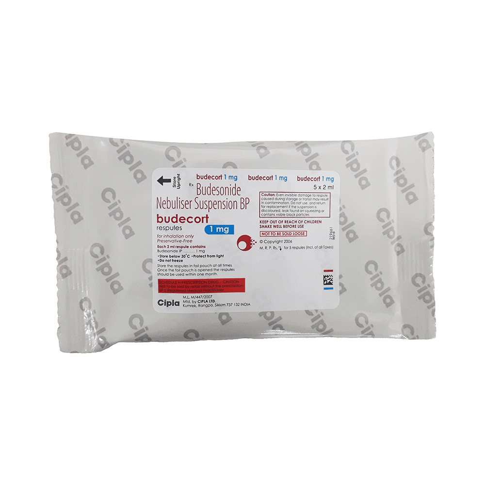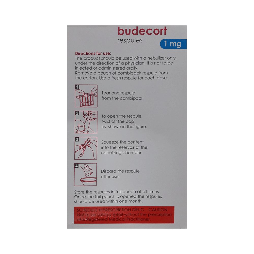 BUDEcort 1mg Respules (2ml Each) is used to prevent the symptoms of asthma (wheezing and shortness of breath). It is a steroid and is known as a "preventer". You need to have a fast-acting “reliever” as well because this medicine will not stop an asthma attack that has already started. Your doctor will tell you how often you need to use BUDEcort 1mg Respules (2ml Each). It is important that you take the lowest dose needed to effectively control your asthma. The effect of this medicine may be noticeable after a few days but will only reach its maximum after a few weeks. This medicine must be used regularly to be effective, so go on taking it even if you do not have any symptoms. No symptoms mean that the medicine is doing its job. If you stop taking it your asthma may get worse. It should not be used to relieve sudden asthma attacks. If an asthma attack occurs, use your quick-relief inhaler "reliever". To get the benefit from this medicine you need to make sure you get your inhaler technique right, otherwise, it will not work as well.The most common side effects are irritation in the throat, difficulty swallowing, headache, and indigestion. If you get these, do not stop taking it but do talk to your doctor. You can help prevent these symptoms by rinsing your mouth and throat with water or brushing your teeth after using your inhaler. There are other rare, side effects that can be serious. Talk to your doctor if you are worried about them. In general, you should be trying to avoid situations that make your asthma worse (your triggers) and try not to smoke.Before taking BUDEcort 1mg Respules (2ml Each), you should tell your doctor if you have tuberculosis, any infections in your mouth or lungs, or liver disease. While taking it you may be more at risk of getting infections so stay away from people with colds and flu. If you use BUDEcort 1mg Respules (2ml Each) for a long time it may cause weak bones (osteoporosis) and damage to your eyes (glaucoma or cataracts). You might need tests for bone density and eye pressure. Ask your doctor whether it’s safe to take this medicine if you are pregnant or breastfeeding.