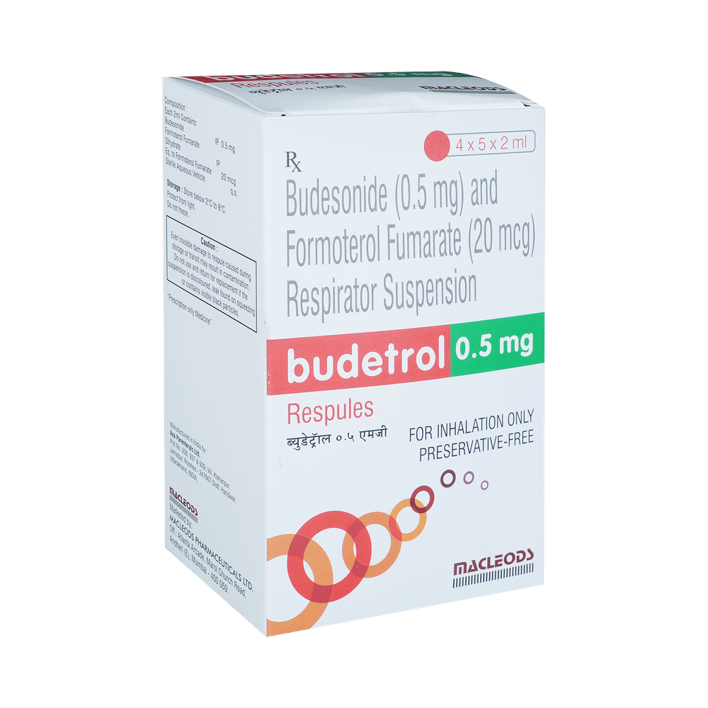 BUDEtrol 0.5mg Respules (2ml Each) is a combination of two medicines in one inhaler. It relieves the long-term symptoms of asthma and COPD, making breathing easier. It works by inhibiting the release of certain chemical messengers that cause inflammation (swelling) and relaxes the muscles in the airways. Your doctor will tell you how often you need to use your inhaler. The effect of this medicine may be noticeable after a few days but will only reach its maximum after a few weeks. This medicine must be used regularly to be effective, so go on taking it even if you don't have any symptoms. That means it’s doing its job. If you stop taking it your symptoms may get worse. This medicine should not be used to relieve sudden shortness of breath. If sudden shortness of breath occurs, use your rescue inhaler. To get the benefit from this medicine you need to make sure you get your inhaler technique right, otherwise, it does not work as well.The most common side effects include headache, nausea, vomiting, stomach discomfort, and respiratory tract infection. If you get there, don’t stop taking it but do talk to your doctor. You can prevent some of these symptoms by rinsing your mouth and throat with water or brushing your teeth after using your inhaler. There are other, rarer side effects which can be serious. Talk to your doctor if you're worried about them.Before taking it, you should tell your doctor if you have any kidney or liver diseases so that your doctor can prescribe a suitable dose for you. You should also tell your doctor if you are pregnant, planning pregnancy or breastfeeding.