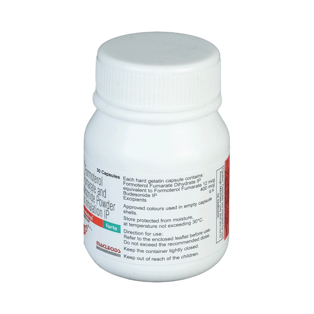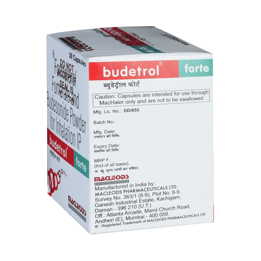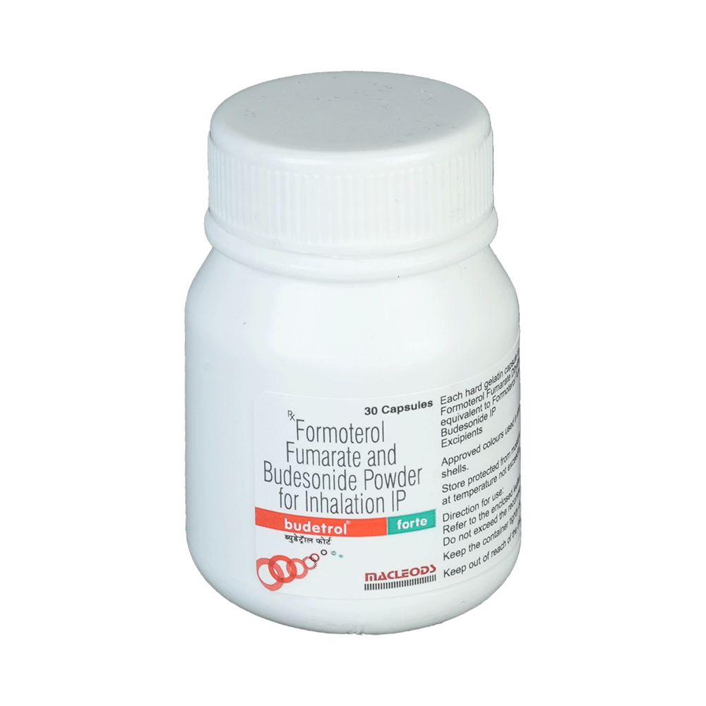 Budetrol Forte Capsule is a combination of two medicines in one inhaler. It relieves the long-term symptoms of asthma and COPD, making breathing easier. It works by inhibiting the release of certain chemical messengers that cause inflammation (swelling) and relaxes the muscles in the airways. Your doctor will tell you how often you need to use your inhaler. The effect of this medicine may be noticeable after a few days but will only reach its maximum after a few weeks. This medicine must be used regularly to be effective, so go on taking it even if you don't have any symptoms. That means it’s doing its job. If you stop taking it your symptoms may get worse. This medicine should not be used to relieve sudden shortness of breath. If sudden shortness of breath occurs, use your rescue inhaler. To get the benefit from this medicine you need to make sure you get your inhaler technique right, otherwise, it does not work as well.The most common side effects include headache, nausea, vomiting, stomach discomfort, and respiratory tract infection. If you get there, don’t stop taking it but do talk to your doctor. You can prevent some of these symptoms by rinsing your mouth and throat with water or brushing your teeth after using your inhaler. There are other, rarer side effects which can be serious. Talk to your doctor if you're worried about them.Before taking it, you should tell your doctor if you have any kidney or liver diseases so that your doctor can prescribe a suitable dose for you. You should also tell your doctor if you are pregnant, planning pregnancy or breastfeeding.