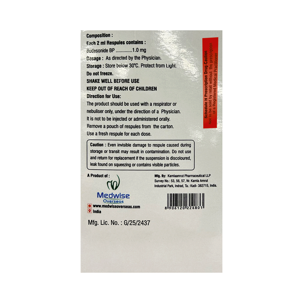 Budewise 1.0 Respule (2ml Each) is used to prevent the symptoms of asthma (wheezing and shortness of breath). It is a steroid and is known as a "preventer". You need to have a fast-acting “reliever” as well because this medicine will not stop an asthma attack that has already started. Your doctor will tell you how often you need to use Budewise 1.0 Respule (2ml Each). It is important that you take the lowest dose needed to effectively control your asthma. The effect of this medicine may be noticeable after a few days but will only reach its maximum after a few weeks. This medicine must be used regularly to be effective, so go on taking it even if you do not have any symptoms. No symptoms mean that the medicine is doing its job. If you stop taking it your asthma may get worse. It should not be used to relieve sudden asthma attacks. If an asthma attack occurs, use your quick-relief inhaler "reliever". To get the benefit from this medicine you need to make sure you get your inhaler technique right, otherwise, it will not work as well.The most common side effects are irritation in the throat, difficulty swallowing, headache, and indigestion. If you get these, do not stop taking it but do talk to your doctor. You can help prevent these symptoms by rinsing your mouth and throat with water or brushing your teeth after using your inhaler. There are other rare, side effects that can be serious. Talk to your doctor if you are worried about them. In general, you should be trying to avoid situations that make your asthma worse (your triggers) and try not to smoke.Before taking Budewise 1.0 Respule (2ml Each), you should tell your doctor if you have tuberculosis, any infections in your mouth or lungs, or liver disease. While taking it you may be more at risk of getting infections so stay away from people with colds and flu. If you use Budewise 1.0 Respule (2ml Each) for a long time it may cause weak bones (osteoporosis) and damage to your eyes (glaucoma or cataracts). You might need tests for bone density and eye pressure. Ask your doctor whether it’s safe to take this medicine if you are pregnant or breastfeeding.