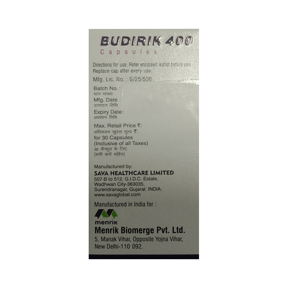 If you miss a dose of Budirik 400 Capsule, use it as soon as possible. However, if it is almost time for your next dose, skip the missed dose and go back to your regular schedule. Do not double the dose.