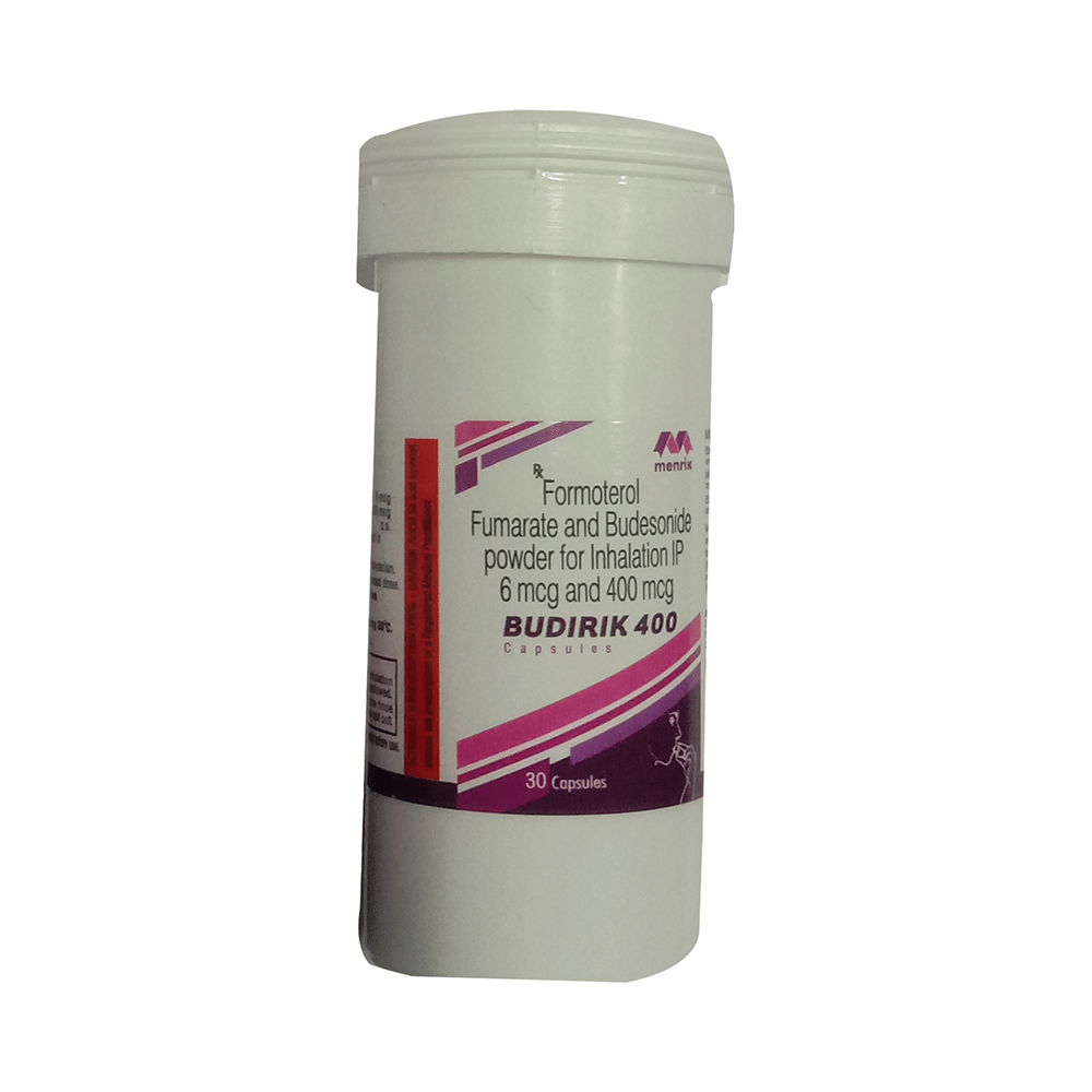 Budirik 400 Capsule is a combination of two medicines in one inhaler. It relieves the long-term symptoms of asthma and COPD, making breathing easier. It works by inhibiting the release of certain chemical messengers that cause inflammation (swelling) and relaxes the muscles in the airways. Your doctor will tell you how often you need to use your inhaler. The effect of this medicine may be noticeable after a few days but will only reach its maximum after a few weeks. This medicine must be used regularly to be effective, so go on taking it even if you don't have any symptoms. That means it’s doing its job. If you stop taking it your symptoms may get worse. This medicine should not be used to relieve sudden shortness of breath. If sudden shortness of breath occurs, use your rescue inhaler. To get the benefit from this medicine you need to make sure you get your inhaler technique right, otherwise, it does not work as well.The most common side effects include headache, nausea, vomiting, stomach discomfort, and respiratory tract infection. If you get there, don’t stop taking it but do talk to your doctor. You can prevent some of these symptoms by rinsing your mouth and throat with water or brushing your teeth after using your inhaler. There are other, rarer side effects which can be serious. Talk to your doctor if you're worried about them.Before taking it, you should tell your doctor if you have any kidney or liver diseases so that your doctor can prescribe a suitable dose for you. You should also tell your doctor if you are pregnant, planning pregnancy or breastfeeding.