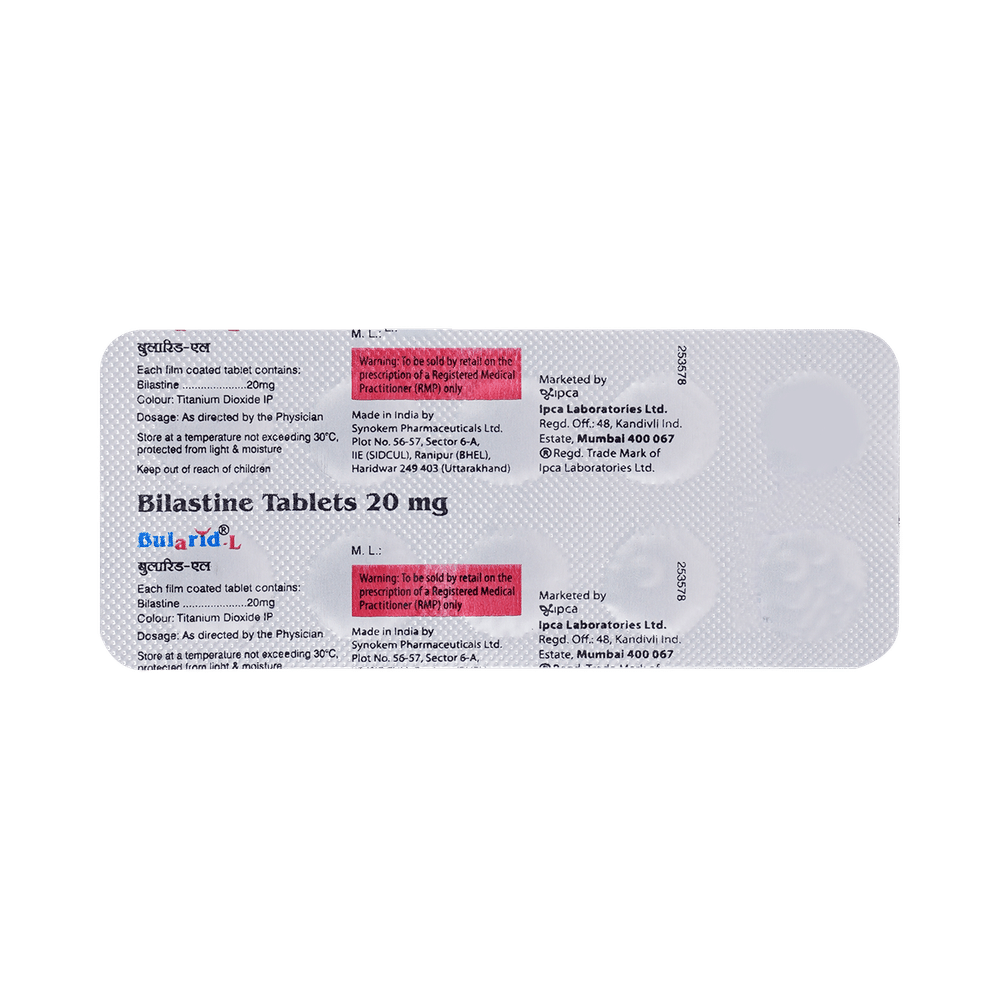 Bularid-L Tablet is an antiallergic medication. It treats allergy symptoms such as such as itching, swelling, and rashes by blocking the effects of a chemical messenger (histamine) in the body.