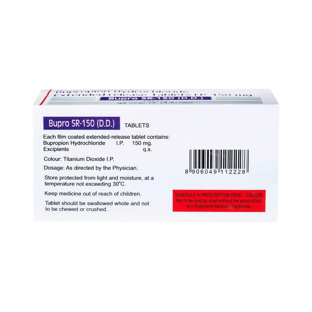 Bupro 150mg Tablet SR is used in the treatment of depression and smoking addiction. This medicine helps by increasing the level of chemical messengers in the brain that relax the nerves and have a calming effect on the brain. Bupro 150mg Tablet SR may be taken with or without food. It is advised to take this medicine at a fixed time each day. You should never skip any doses and finish the full course of treatment even if you feel better. This medication mustn't be stopped suddenly as it may worsen your symptoms.Some common side effects of this medicine include insomnia (difficulty sleeping), allergic reaction, impaired concentration, sweating, headache, nausea, vomiting, and dry mouth. It even causes dizziness and sleepiness, so do not drive or do anything that requires mental focus. Moreover, most of the side effects are immediate and often go away with time. Please consult your doctor if these bother you or do not go away.Before taking this medicine it is important to inform your doctor if you have any history of seizure or if you drink alcohol. Inform your doctor if you develop any unusual mood changes or if you have any suicidal thoughts.