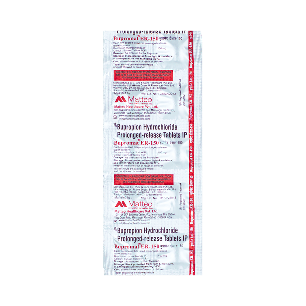 Bupromat ER 150 Tablet is used in the treatment of depression and smoking addiction. This medicine helps by increasing the level of chemical messengers in the brain that relax the nerves and have a calming effect on the brain. Bupromat ER 150 Tablet may be taken with or without food. It is advised to take this medicine at a fixed time each day. You should never skip any doses and finish the full course of treatment even if you feel better. This medication mustn't be stopped suddenly as it may worsen your symptoms.Some common side effects of this medicine include insomnia (difficulty sleeping), allergic reaction, impaired concentration, sweating, headache, nausea, vomiting, and dry mouth. It even causes dizziness and sleepiness, so do not drive or do anything that requires mental focus. Moreover, most of the side effects are immediate and often go away with time. Please consult your doctor if these bother you or do not go away.Before taking this medicine it is important to inform your doctor if you have any history of seizure or if you drink alcohol. Inform your doctor if you develop any unusual mood changes or if you have any suicidal thoughts.