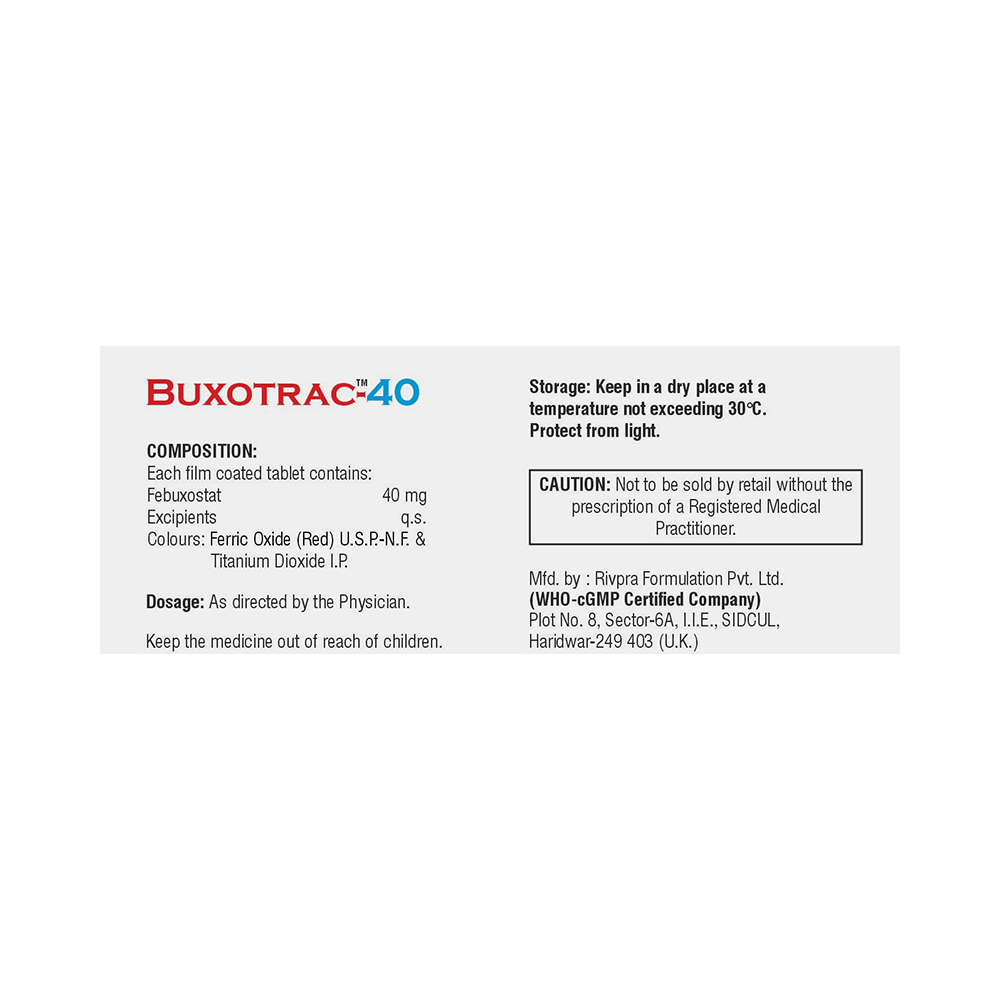 Buxotrac 40 Tablet is a xanthine oxidase inhibitor. It works by decreasing blood uric acid, which is the chemical that causes gout.
