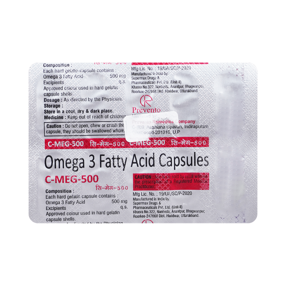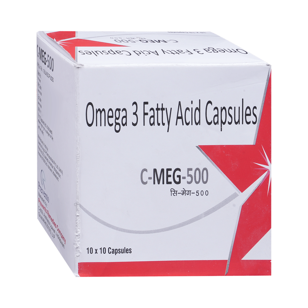 C-Meg 500mg Capsule is a medicine used in the treatment of nutritional deficiencies. It is an essential nutrient with good antioxidant property. It is beneficial for healthy heart, blood vessels, brain, and eye in addition to many other health benefits. C-Meg 500mg Capsule is best taken with food. This will prevent you from gastrointestinal disturbances. Take it in the dose and duration advised by the doctor. Take it regularly and at the same time each day to get maximum benefits from it. Do not take it more than or longer than prescribed by the doctor, as that may cause harmful effects.Common side effects of this medicine include nausea, vomiting, and flatulence. If any of these side effects do not resolve on their own or get worse, let your doctor know. To make sure it is safe for you, let your doctor know about all the other medicines you are taking. Use this medicine with caution if you are allergic to fish or fish products.
