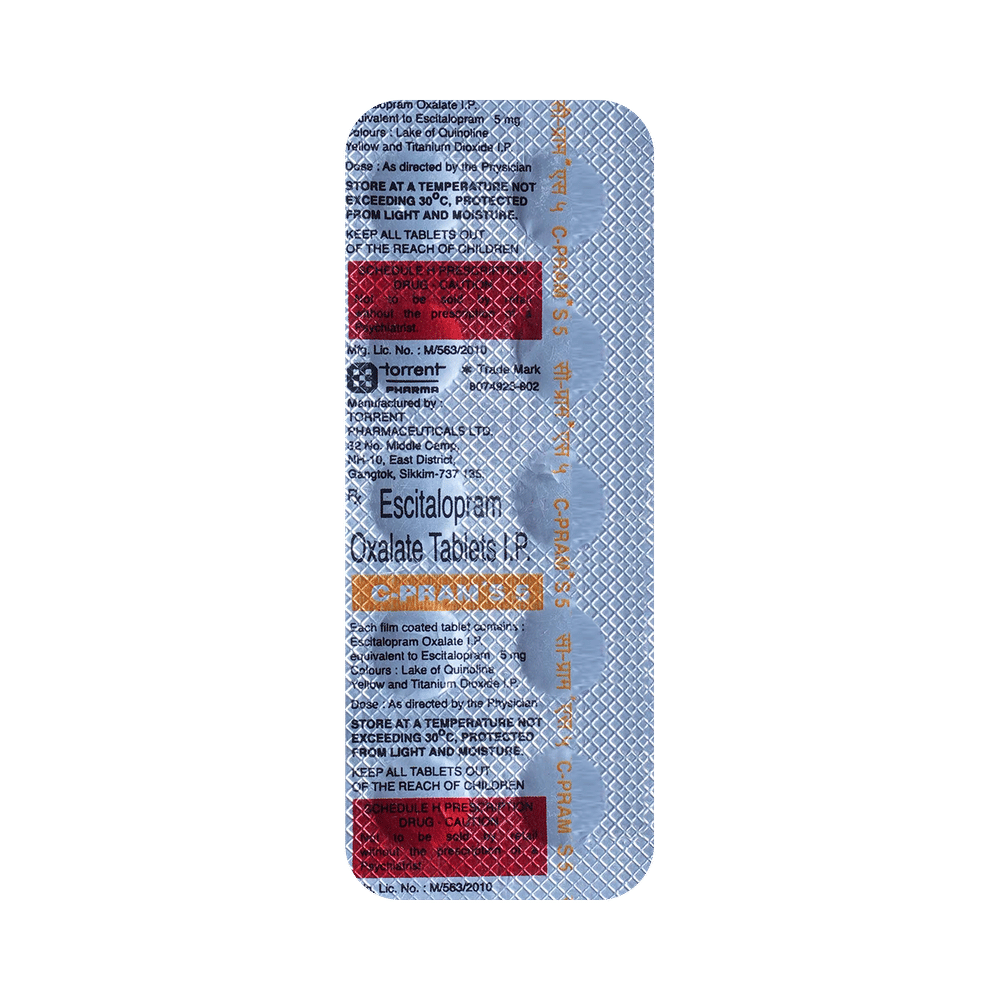 C-Pram S 5 Tablet is widely prescribed to treat depression and other mental health conditions like anxiety, panic disorder, and obsessive-compulsive disorder. It is a type of antidepressant known as a selective serotonin reuptake inhibitor (SSRI). C-Pram S 5 Tablet helps recover from depression by improving mood and relieving anxiety and tension. It can be taken with or without food. The dose and how often you need it will be decided by your doctor based on the amount needed to control your symptoms. Your doctor may start you on a lower dose and increase it gradually. Do not change the dose or stop taking it without talking to your doctor, even if you feel well. Doing so may make your condition worse or you may suffer from unpleasant withdrawal symptoms such as anxiety, restlessness, palpitations, dizziness, sleep disturbances.To get the most benefit, take this medicine regularly at the same time each day. Your doctor may advise you to take it in the morning if you have trouble sleeping. It may take a few weeks before you start feeling better. Let your doctor know if you do not see any improvement even after 4 weeks.Some common side effects of this medicine include nausea, fatigue, increased sweating, insomnia (difficulty in sleeping), decreased sexual drive, delayed ejaculation, and women may experience difficulties achieving orgasm. Some people may experience sleepiness after taking this medicine. Let your doctor know straight away if you develop any sudden worsening of mood or any thoughts about harming yourself.Before taking C-Pram S 5 Tablet, you should tell your doctor if you have epilepsy (seizure disorder or fits), diabetes, liver or kidney disease, any heart problems, or are currently taking medicines for depression known as MAO inhibitors. These may affect your treatment. Please tell your doctor about all the medicines you are taking to make sure you are safe.