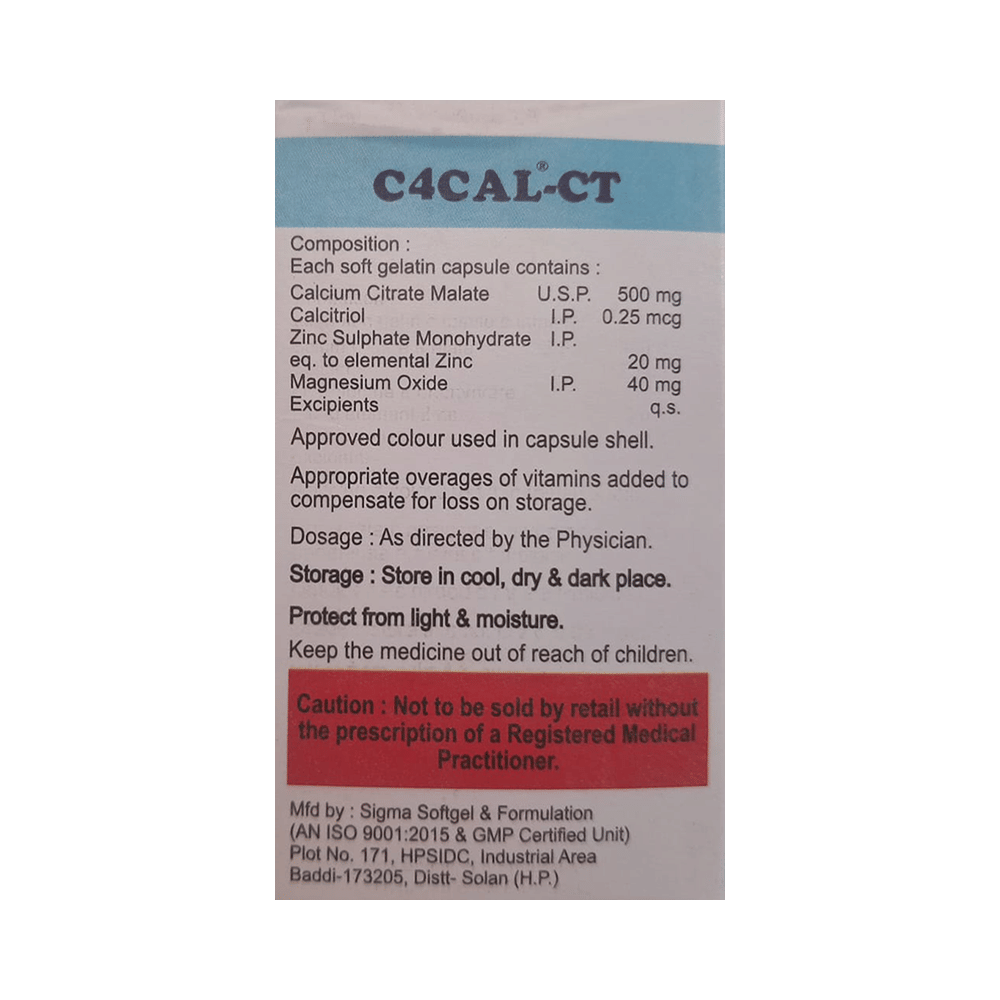 C4Cal-CT Softgel Capsule is a combination of vitamins and mineral supplements prescribed to treat vitamin and other nutritional deficiencies. It ensures proper growth and functioning of the body and strengthens immunity. C4Cal-CT Softgel Capsule is taken orally with or without food. It should be used in the dose and duration prescribed by your doctor. It is advised to take this medicine at a fixed time to avoid missing a dose.C4Cal-CT Softgel Capsule is usually a safe medicine with minimal or no side effects. However, if you experience severe diarrhea, vomiting, or constipation, consult your doctor without delay.Before taking this medicine, tell your doctor if you have any other health conditions. Inform them if you are taking any other medicines or are pregnant or breastfeeding. It is advised not to take alcohol after taking this medicine.